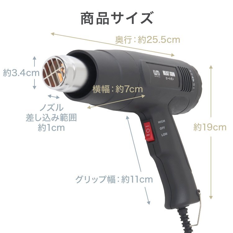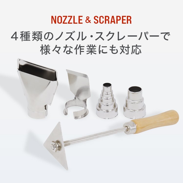80℃~600℃と低温から高温まで幅広く温度調整でき、 素材に合わせて適切な温度で作業が可能です! ハイパワー&2段階風量切り替えで、作業効率UP間違いなし! また、立てて使えるスタンドフック付で、両手を使う作業がしやすくなります。 様々な作業に対応できる4種類のノズルとスクレーパー付属です。 【商品仕様】 サイズ:(約)25.5×19cm コード長さ:(約)約140cm 重量:(約)0.7kg 電源:100V 50/60Hz(一般の家庭用電源でも使用可能) 電力:1200W 商品コード:A47B 【商品内容】 本体、ノズル4種類、スクレーパー1本、日本語取扱説明書 【注意事項】 ・使用中及び使用後も先端ノズルが大変熱くなりますので十分に注意して下さい。 ・ドライヤーの様には使用できません。髪や衣類の乾燥には絶対に使わないで下さい。 (ホットエアガン エンボスヒーター ヒーティングガン 熱風機 工具 超強力 ハイパワー 600度 軽量 軽い 自立 直立 PSE PSEマーク ノズル アタッチメント スクレーパー 温風 塗装 解凍 焼き入れ 溶接 フィルム 収縮 曲げ 成形 爪折り 除去 メンテナンス ハンドメイド 手芸 おしゃれ プレゼント WEIMALL ウェイモール) |