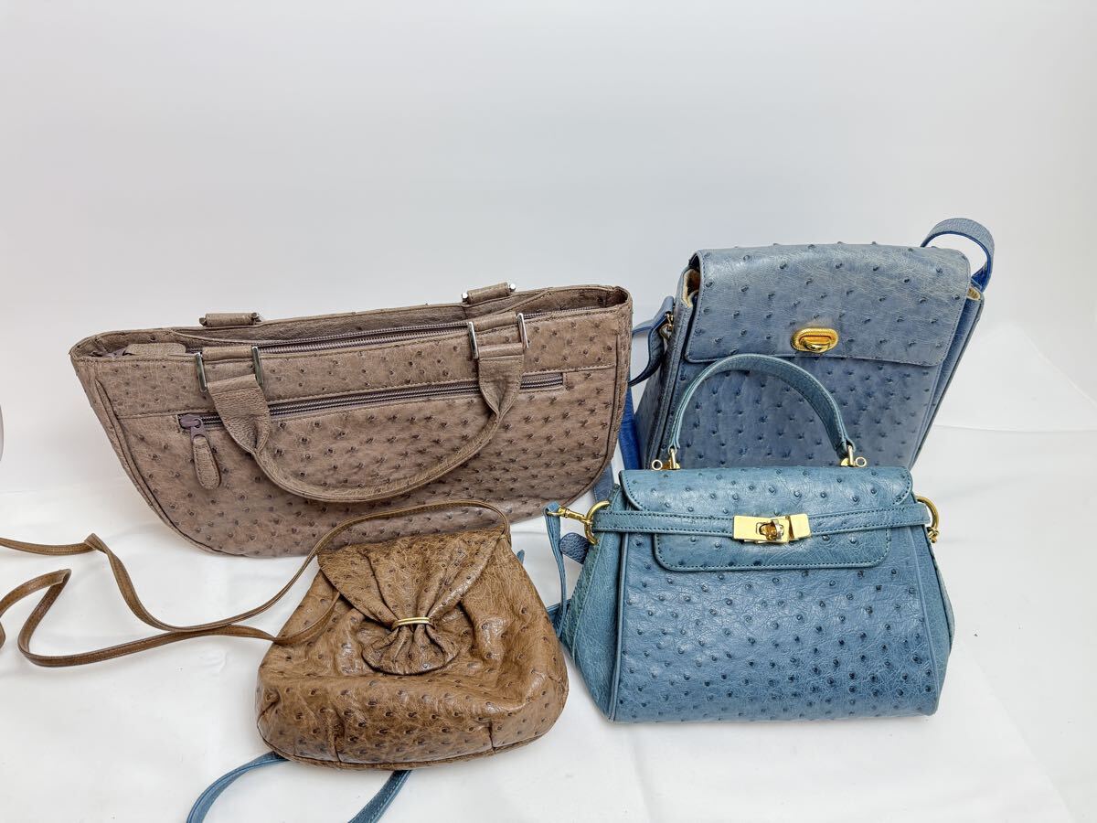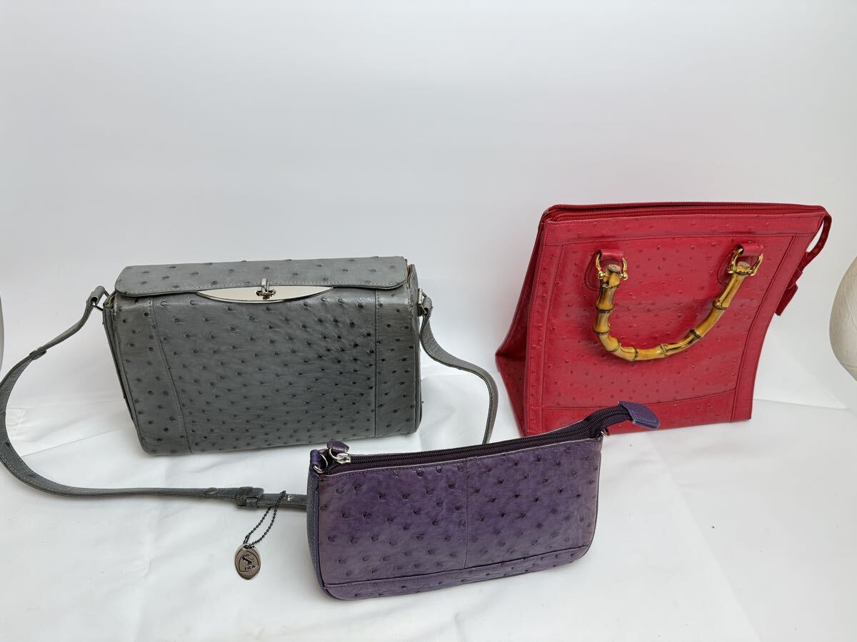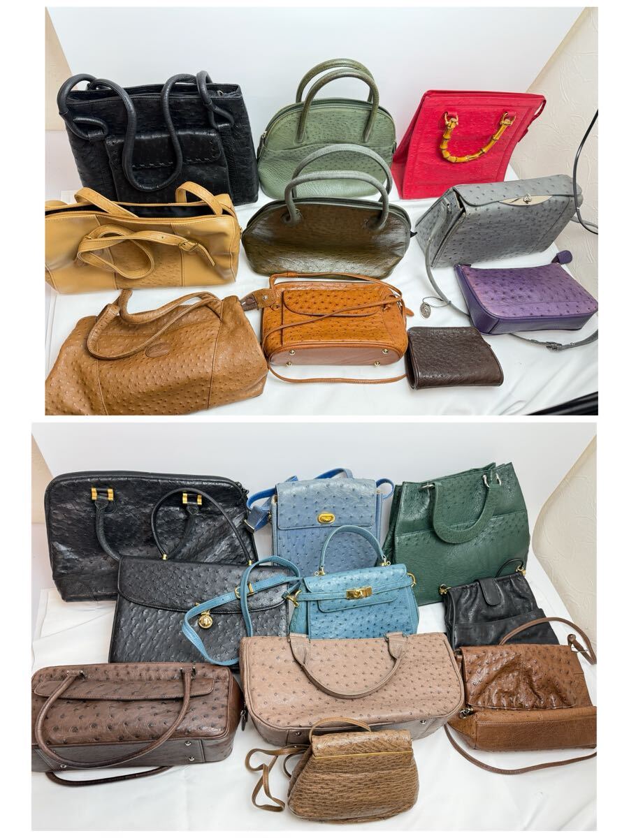 オーストリッチ(ダチョウ革)のバッグ類を中心とした、トートバッグ・ショルダーバッグ・ハンドバッグ・ポーチなどの20点セットまとめ売りです。