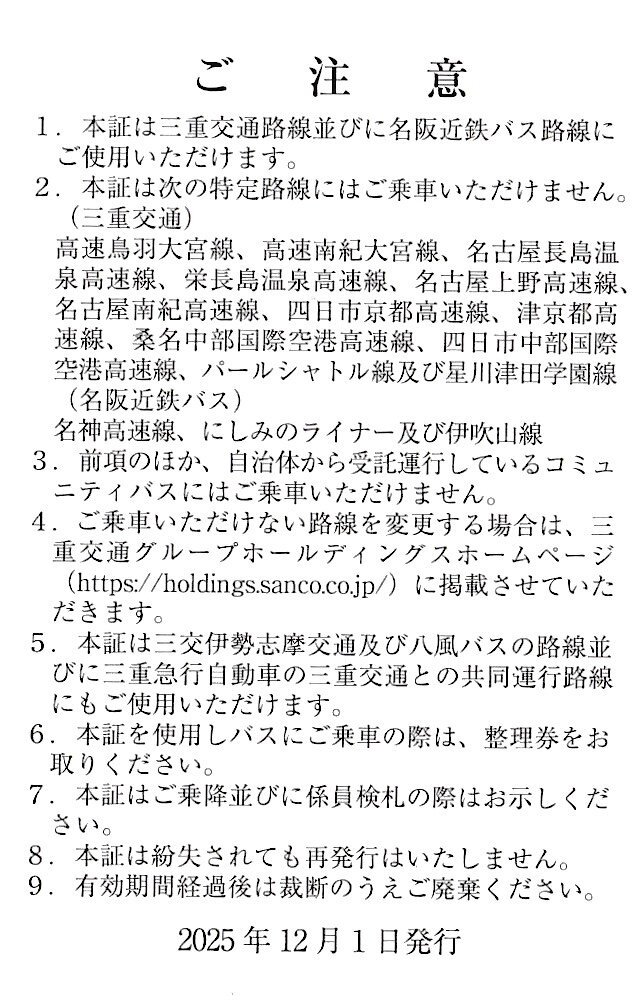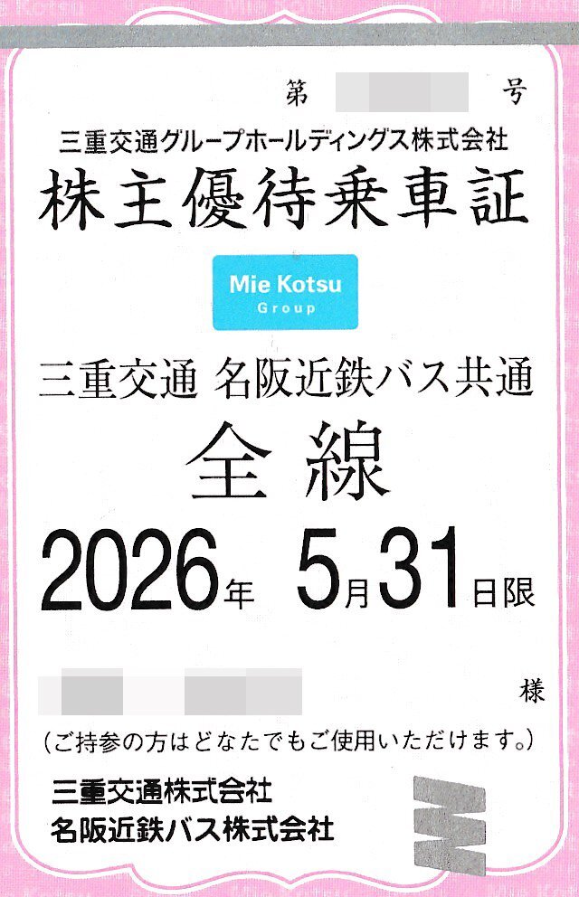 | 出 品 商 品 | 三重交通グループホールディングス株式会社 株主優待乗車証 1枚 |