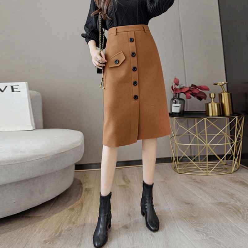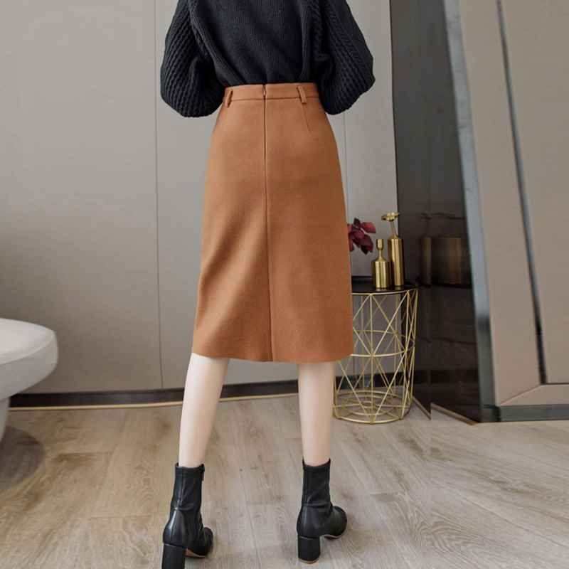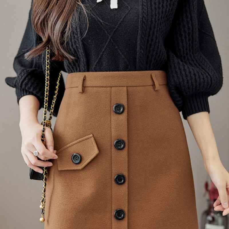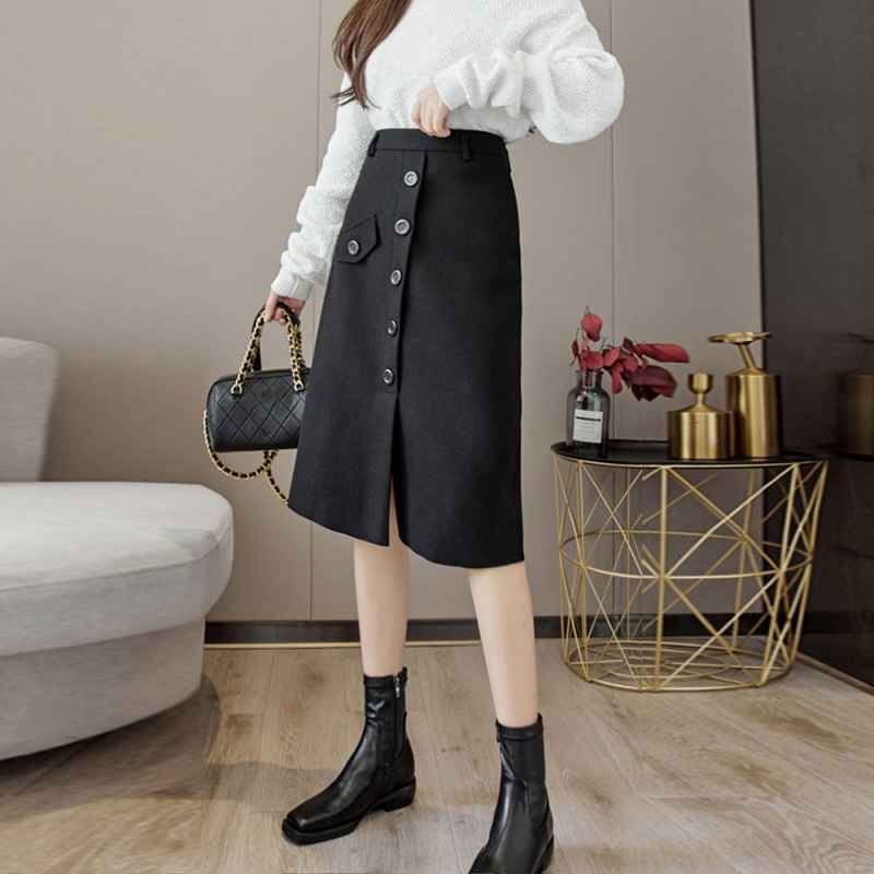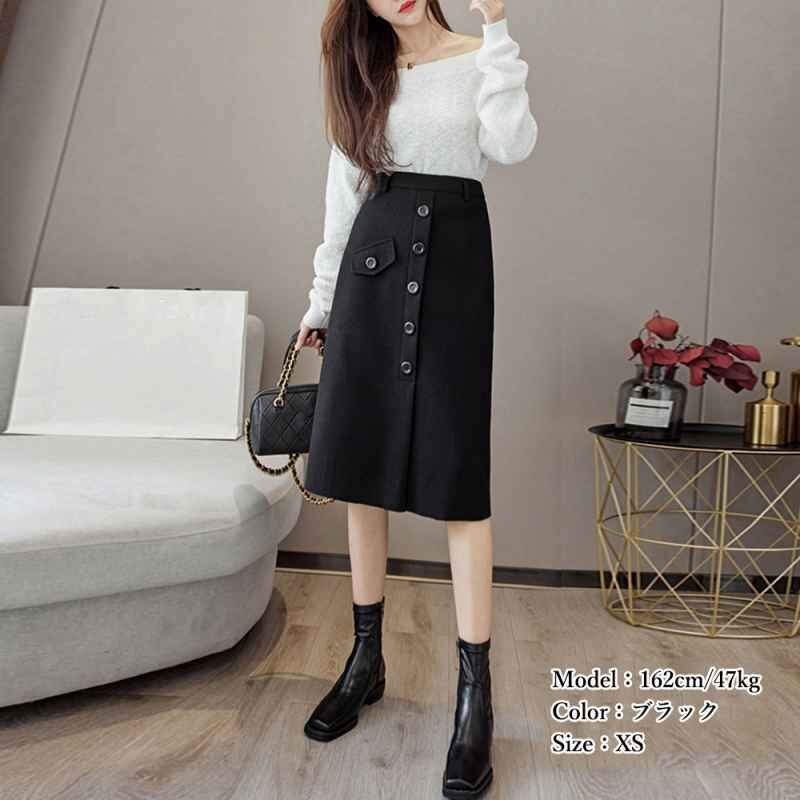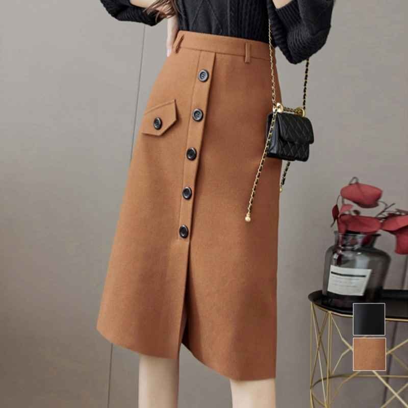前のポケットと一列のボタンがさびしくなりがちなスカートにアクセントを加え、タイトシルエットにフロント部分スリットがあるので、通勤時の階段の昇り降りも楽々!