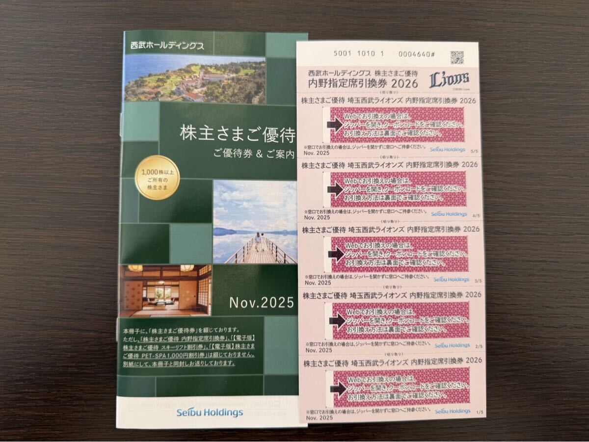 1円〜!【送料無料】 西武ホールディングス 株主優待券一式 パリーグ内野席引換券5枚 西武株主優待小冊子1冊 1000株主用でございます!