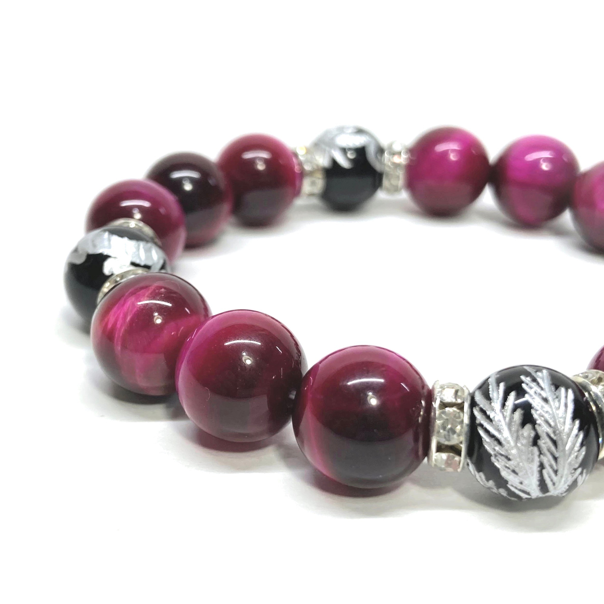 四神獣銀彫オニキス×ピンクタイガーアイ 12mm パワーストーン ブレスレット 天然石 青龍 白虎 玄武 朱雀 運気上昇 開運 金運 お守り S
