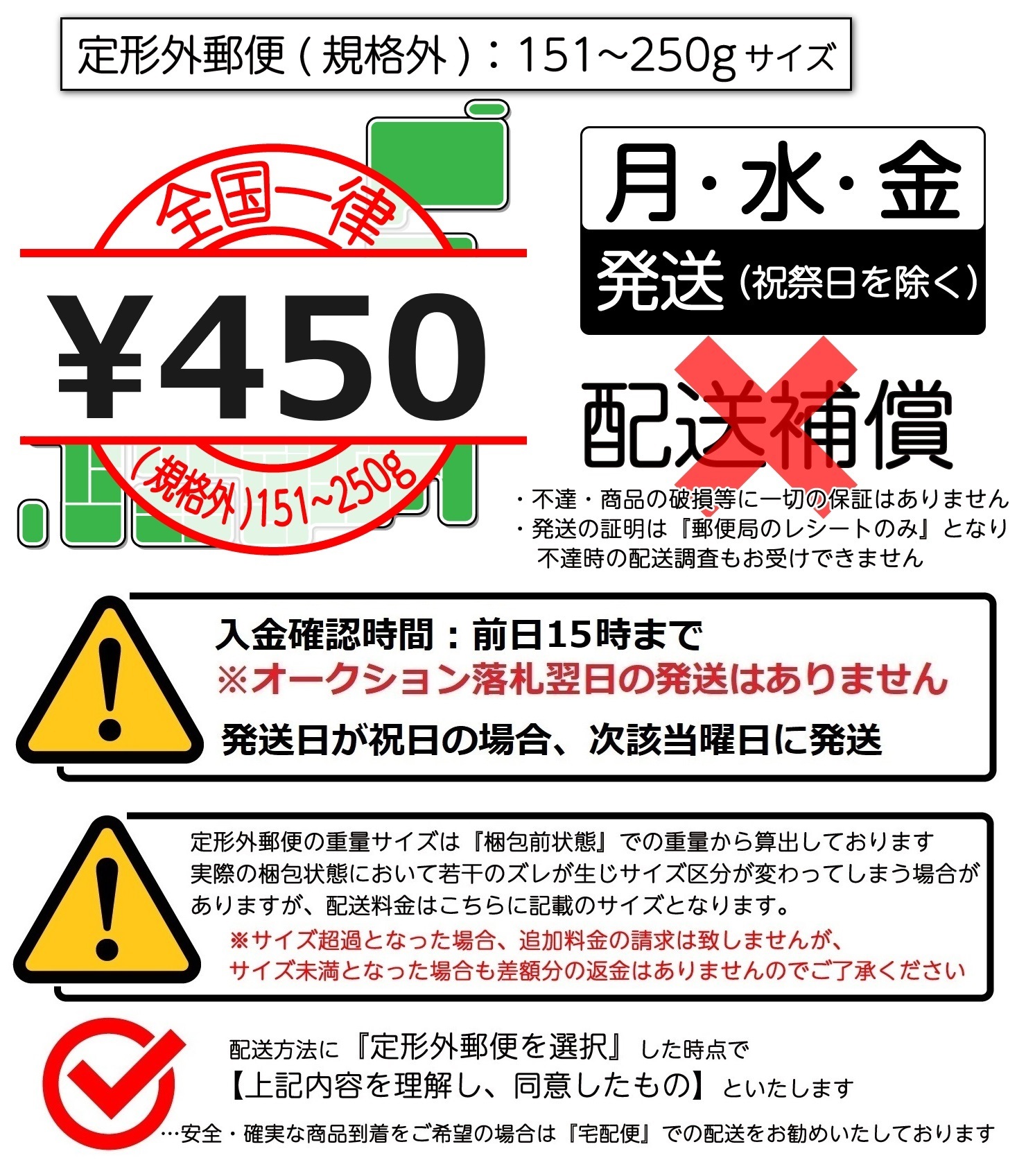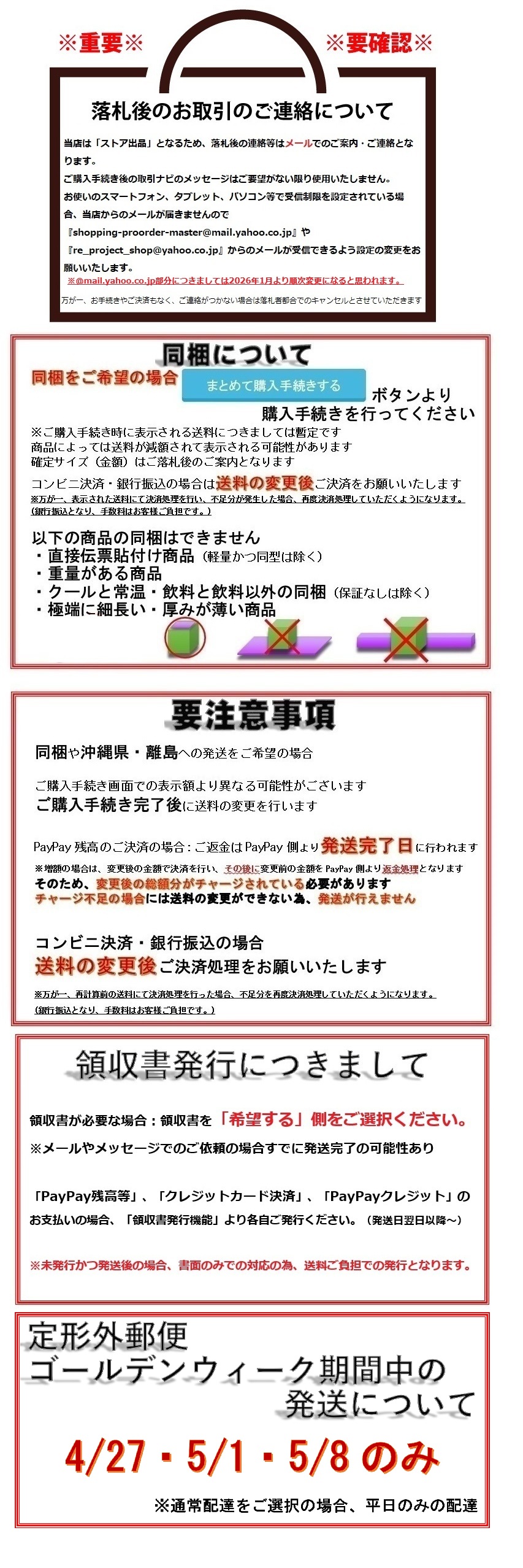 ※同梱可能商品に限ります。 定形郵便や定形外郵便(規格内)と定形外郵便(規格外)の同梱(定形外郵便発送)につきましては 佐川急便をご選択の上、ご要望欄に定形外郵便発送希望とご入力ください。 ご購入手続きが完了ののち、当方より手動で『お支払い総額のご案内』と『送料の変更』をいたします。 ご決済時の注意事項は下記をご高覧願います。 ◆沖縄県・離島への発送、同梱希望の場合のご決済について ■クレジットカード決済、PayPayクレジット 再度オーソリゼーションが行われます。 万が一、通らなかった場合は銀行振込となります。 ■銀行振込の場合 ご案内前の内容ではご決済しないようにお願いいたします。 万が一、不足金額にてご入金いただいた場合、不足分の追加入金の確認ができるまで商品の発送ができませんのでご了承ください。 超過分につきましては、銀行振込にて手数料を差し引いてのご返金となります。 ■コンビニ決済の場合 (※12月はご利用できません) 再度お支払番号を発行いたしますので、新たなお支払番号にてご決済ください。 ■PayPay残高等払いの場合 ご購入手続き時の表示金額より減額・増額により、お手続きが異なります。 減額となる場合: 発送完了日にPayPay側より返金処理となります。 増額となる場合: 変更後の金額で決済を行い、 その後に変更前の金額をPayPay側よりご返金処理となります。 ※増額となる際にチャージ不足の場合には、送料の変更ができない為、発送が行えません。 不足額のみのご決済はYahoo!オークションシステム上、銀行振込のみ対応可能です。 Yahoo!ショッピングヘルプ PayPay残高等払いについて(旧名称:PayPay残高払い・PayPay(残高)) https://support.yahoo-net.jp/PccShopping/s/article/H000011025#changeamount ◆普通郵便でのオプションについて
