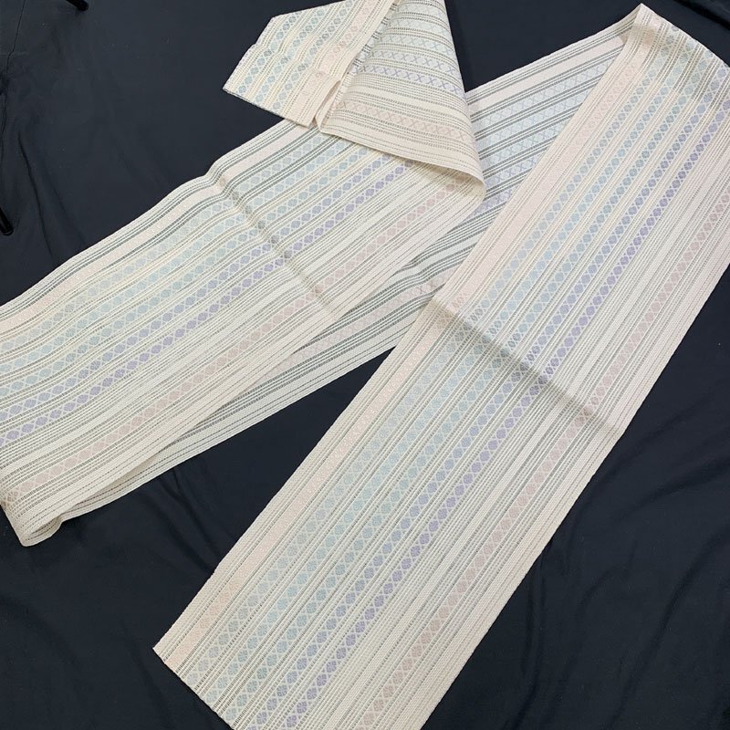 ◆本場筑前博多織 羅組間道 八寸名古屋帯 夏帯◆美品 (No.gnd) 涼し気な本場筑前博多織、羅組間道の八寸名古屋帯です。 特筆すべきダメージもなく美品です。 【素材】正絹 【色】オフホワイト *モニターによって色味は実際と異なる場合がございます。 【サイズ】幅:31cm、長さ:387cm *素人採寸のため、多少の誤差はご容赦ください。 上質な逸品ですので、いかがでしょうか?よいお品物でお勧めです^^ |