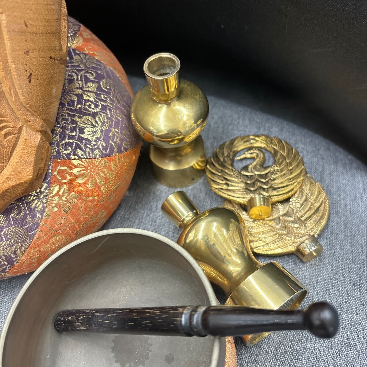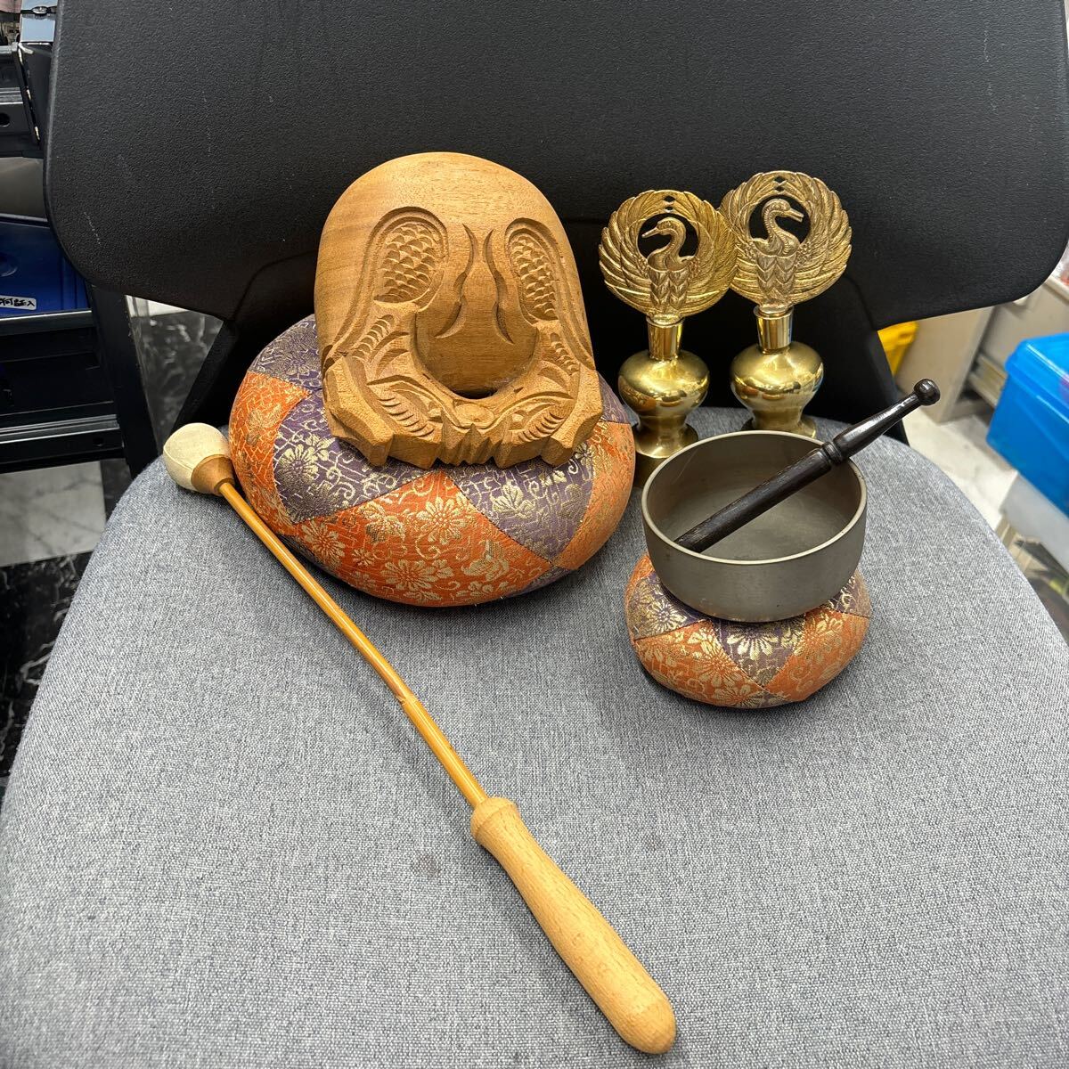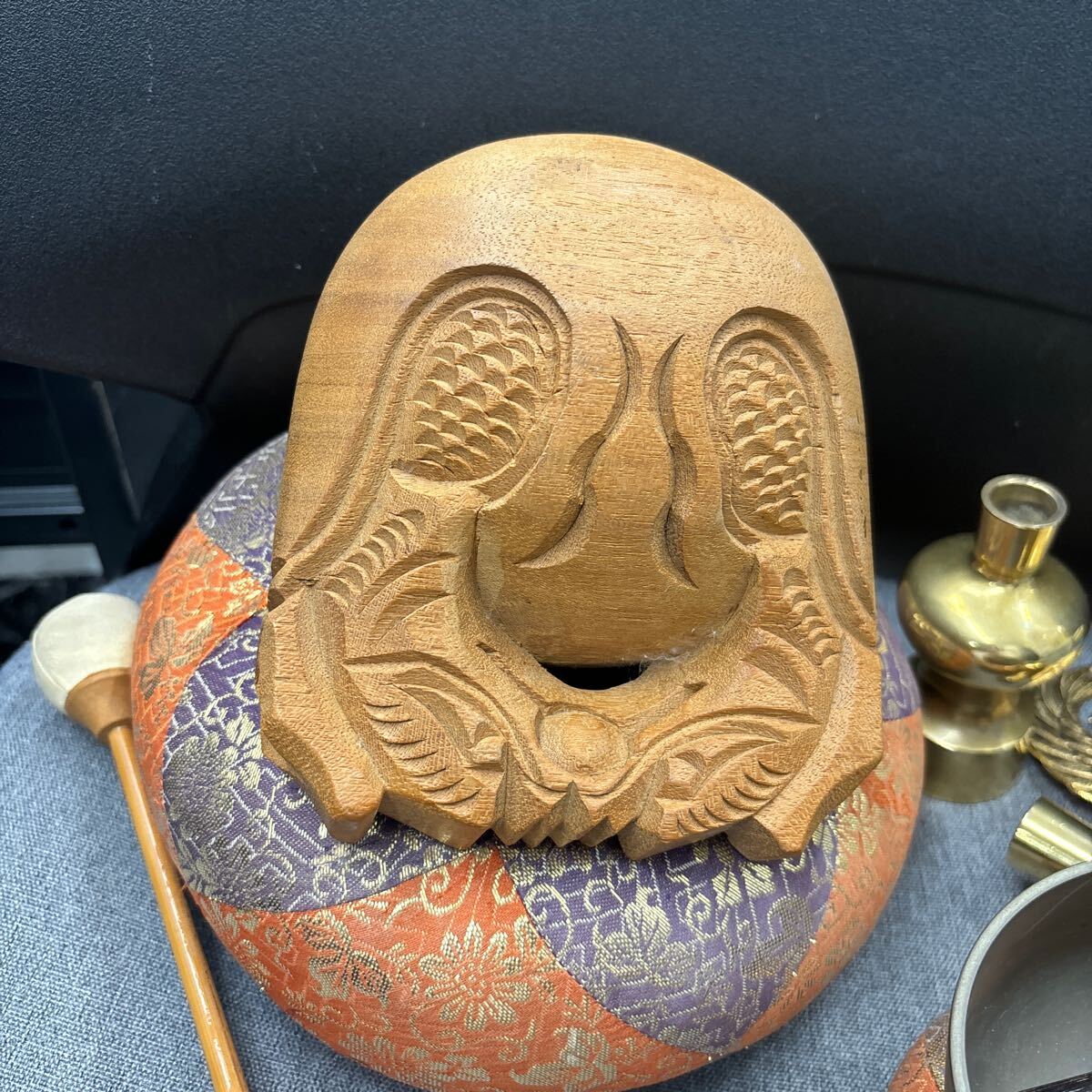 木魚は横幅13センチ、高さ9センチです。おりんの直径は9センチ、高さ4センチです。座布団付きです。