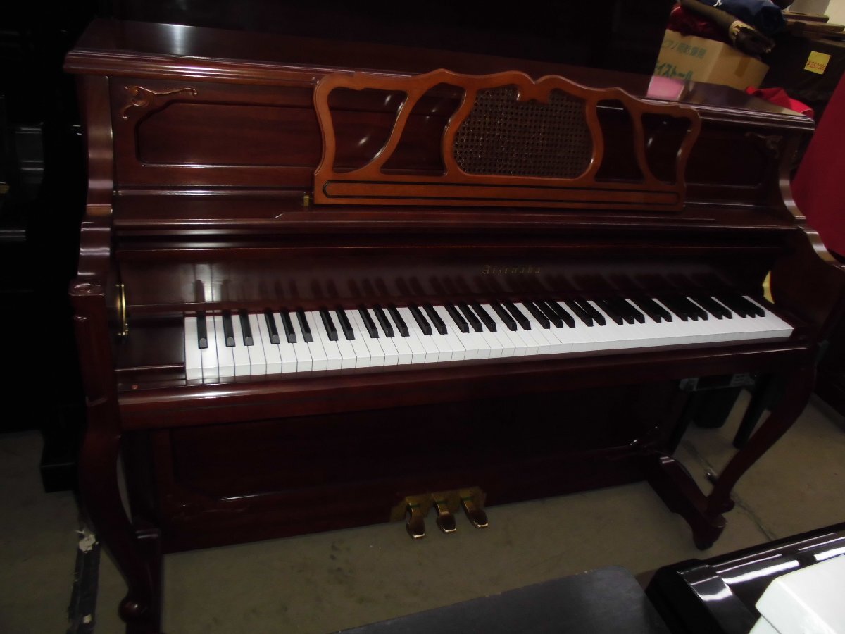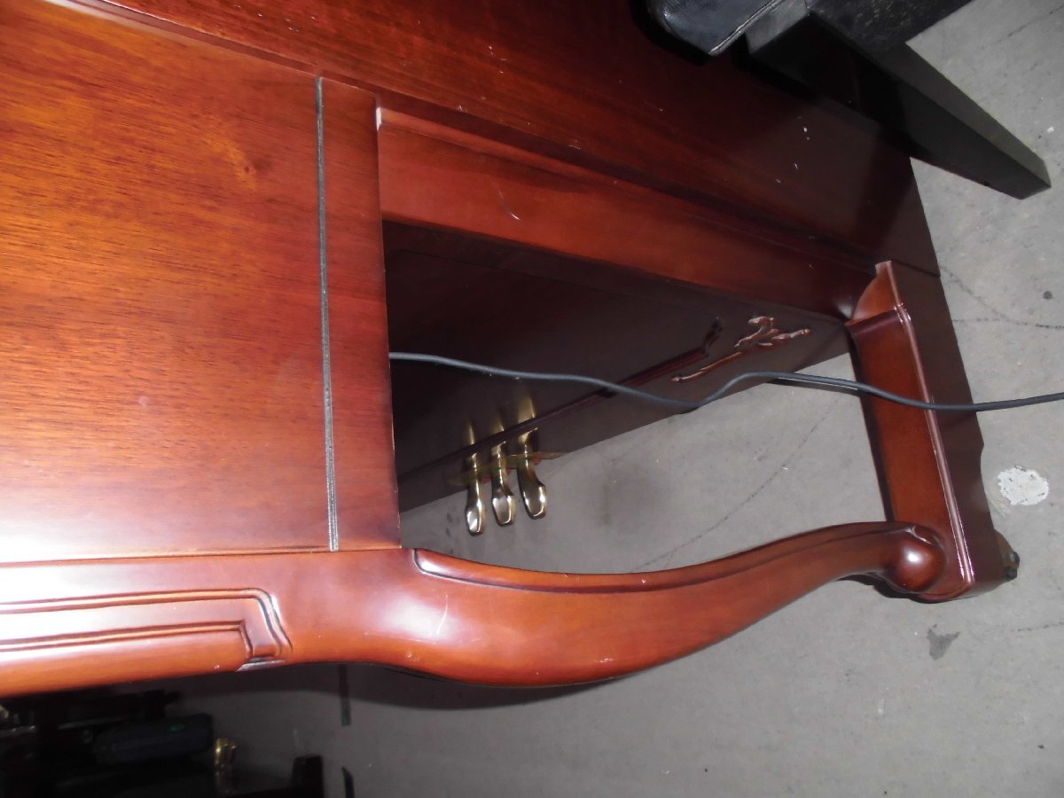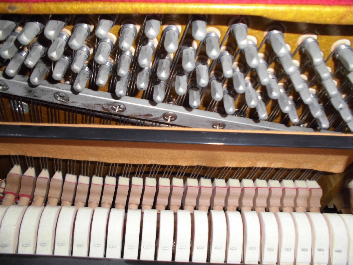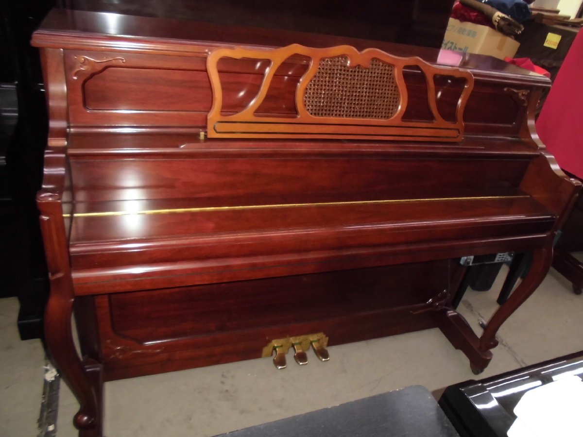 美しい、良いピアノを格安・お買い得価格にてご提供いたします!更に値下げしました! 東洋ピアノが輸入して監修した外国製のピアノです。生産国は韓国の様です。小型の、チッペリング脚、マホガニー系の木目を生かしたきれいなピアノです。お部屋に設置されて、カラーとデザインが家具調に違和感なく溶け込みます。色合いは写真2、6,7,8の色合いが良く出て参考になります。使用頻度は少なく、機械部分のアクションのハンマーの摩耗は殆どありません。これからも充分の間20年以上はお弾き頂けます。もし、長持ちに心配がおありの方は、1年に一度とは申しませんが、2~3年間隔にでも調律をされる事をお勧めします。音律の保持と共に長持ちの秘訣です。外装にもほとんど傷は有りません。本当に綺麗な中古です。只、大事に保管されていましたが、中古で良く見れば小さな内傷や擦り傷は有るかも知れません。外装の磨き出し、調律、整調を済ませてお届けします。このピアノに夜間や近隣、階上階下の方に気兼ねなく何時でもレッスン出来るサイレンサーを取り付け出来ます。本体価格145,000円、取り付け費45,000円ですがお求め時に取り付けられる場合には、取り付け費を無料にて承ります。に気兼ねなく下見、試弾を歓迎します。Webショップではご覧頂けなくても、安心してお求め頂ける様に努めております。又、遠隔地・北は北海道から鹿児島まで運んだ実績が多数あります。又、お届け後には必ず調律を実施しております。が、試弾、下見をご希望される方を歓迎します。お見え頂く前に一報頂けますと確実です。お気に入って頂けましたら当オークションにて落札下さい。付属品を無料にてお付けします。高低出来る新高低椅子、トップカバー、洋間には丸台、和室には敷板、キーカバー、艶出し材、磨き布をお付けします。又、別途にオプションにて、防振・防音用の丸台も中古4,000円で、他にも防振。防音用品を格安にてお取り寄せします。故障保証を5年間致します。ピアノは丈夫で殆ど故障は有りませんが、稀に雨が続いた折に、音が出難い、鍵盤が動き難い等の不具合が起こる事が有ります。もし、起きた場合には応急処置の仕方をmail等でご説明し、その後、御地を訪れた際に修復します。お届けします。1階・階段5段位、段差50cm位、マンションでエレベータに載る等の比較的に平易な条件の方には自社便にて無料お届けします。お部屋に設置後、調律を無料にて致します。無料お引き取りをします。電子ピアノ、電子オルガン、エレクトーン、古~~いピアノ等をお引き取りします。