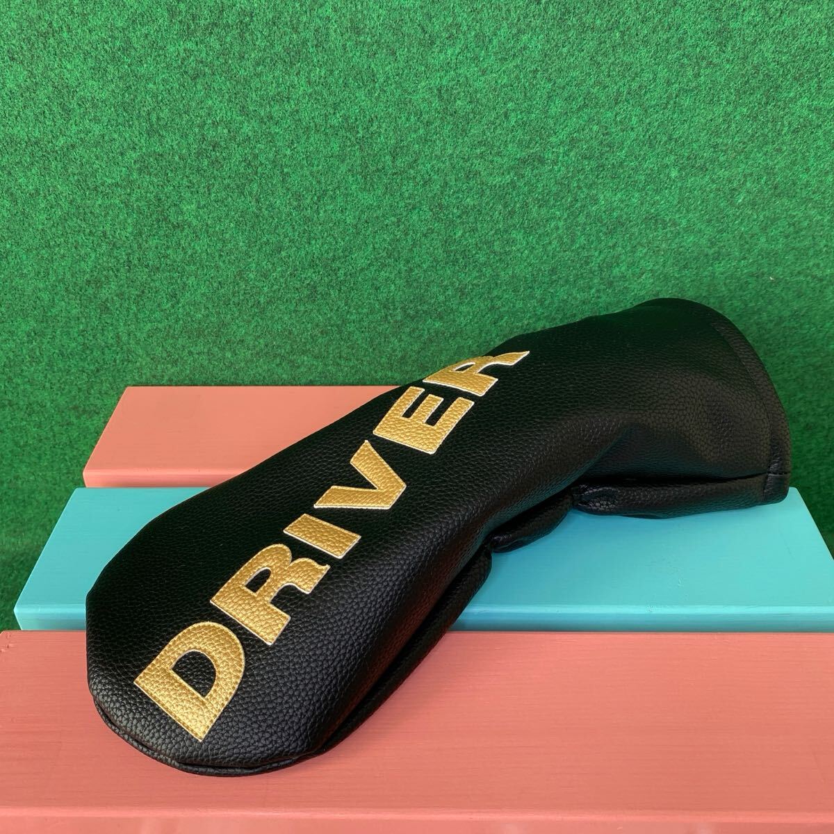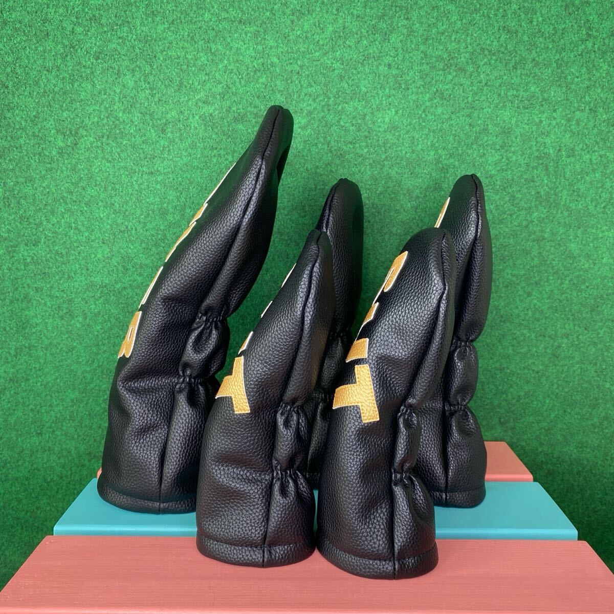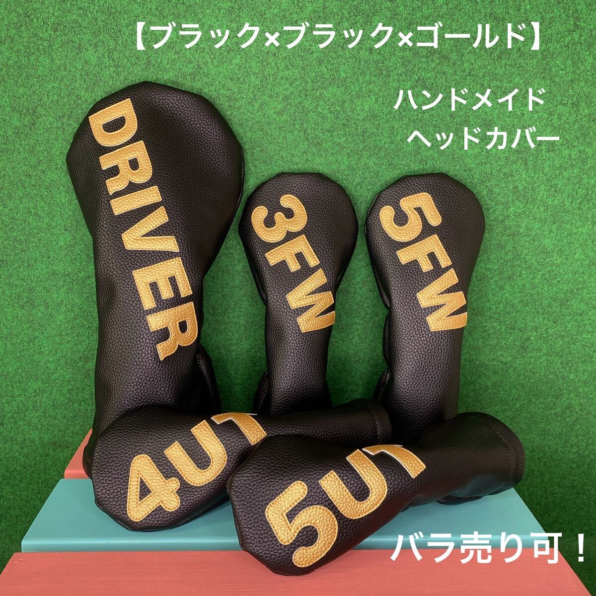 全国送料無料!バラ売り可!【ゴルフクラブ用ヘッドカバー ブラック×ブラック×ゴールド 】ハンドメイド 黒 合皮 フェイクレザー