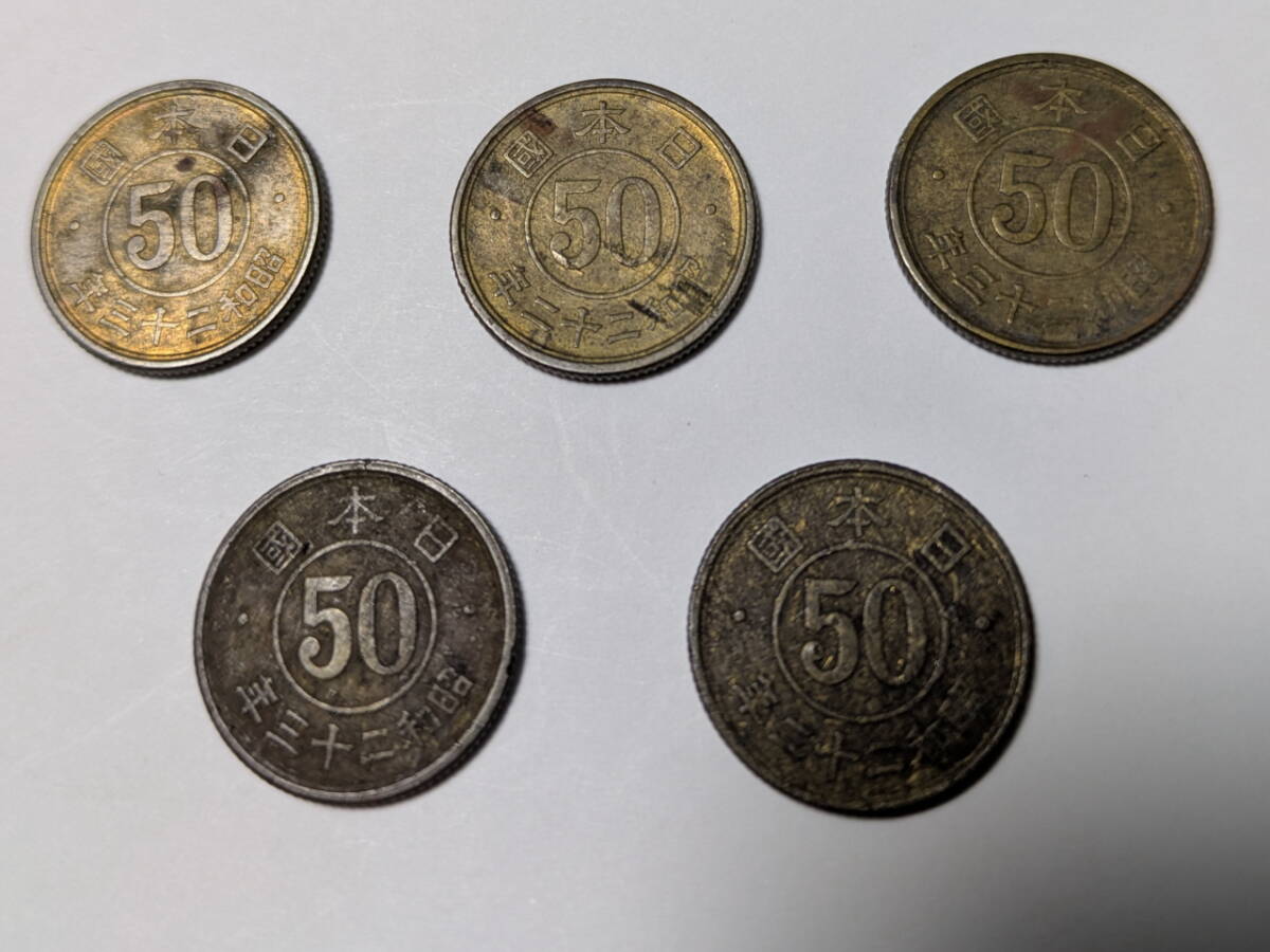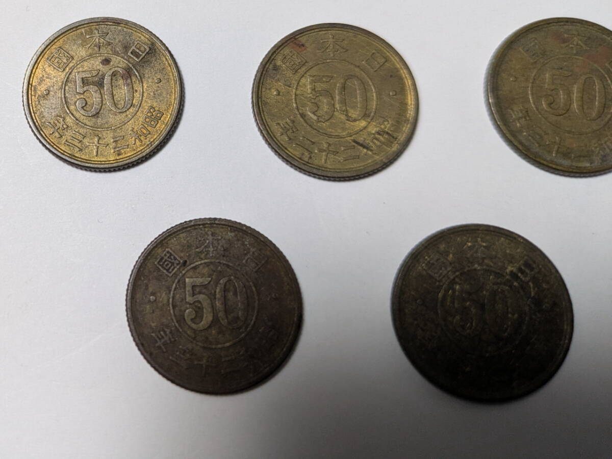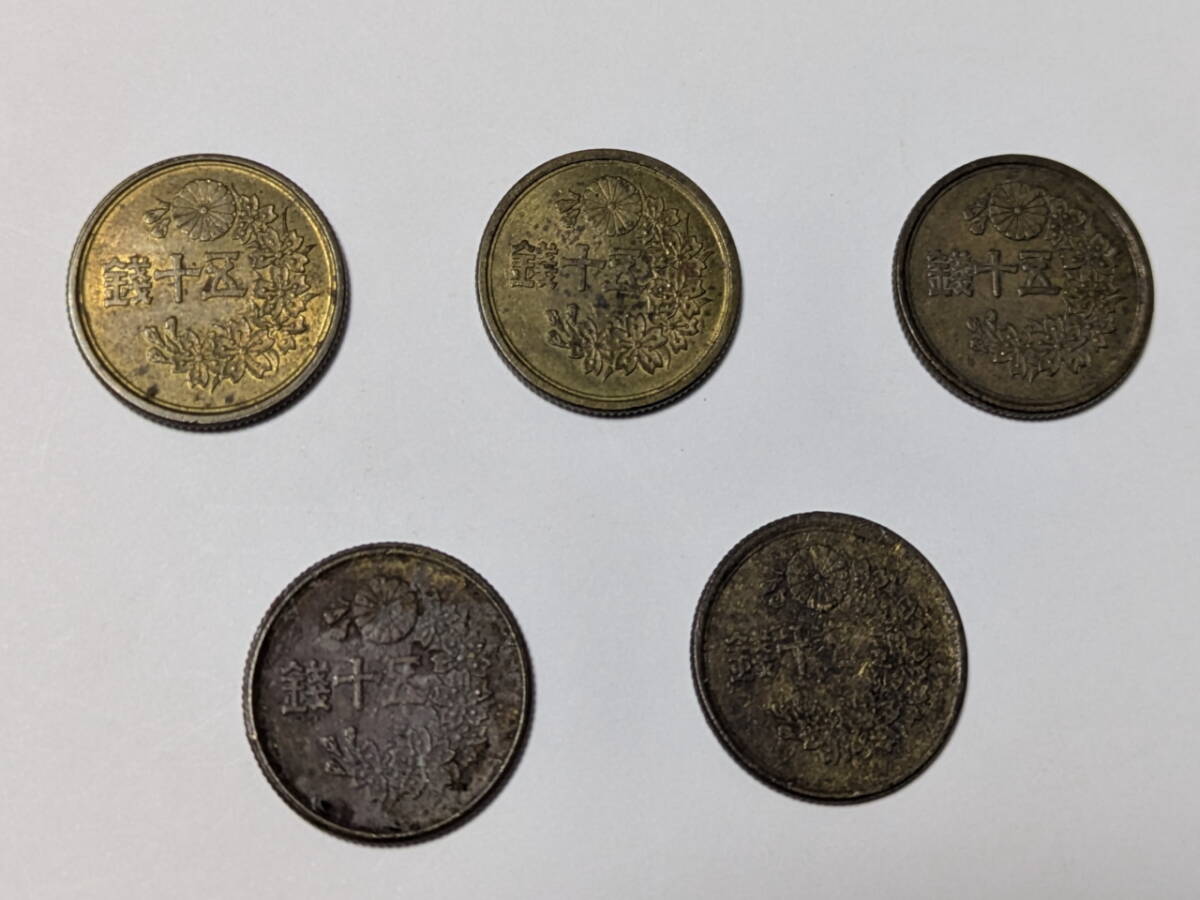 小型五十銭黄銅貨 50銭 昭和22年 昭和23年 アンティーク 桜の花輪と菊紋 5枚セット 管理49