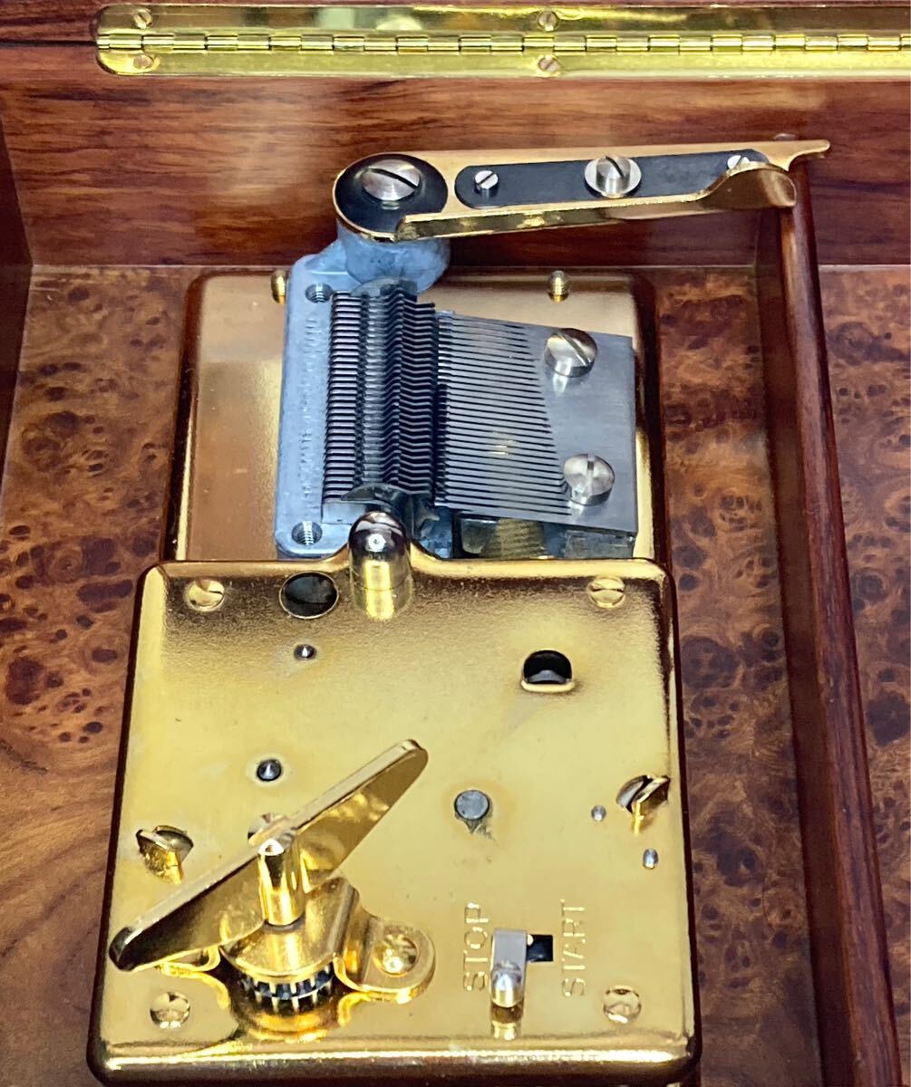 ゼンマイを巻き、レバーをSTARTへスライドさせると演奏されます。