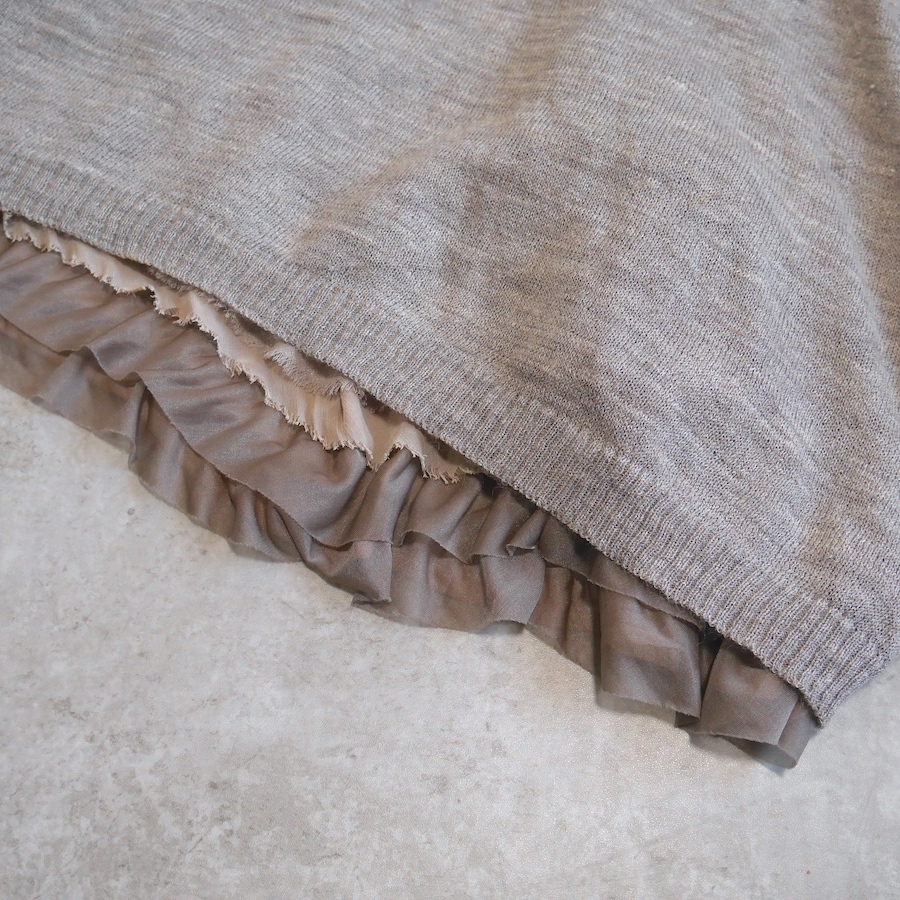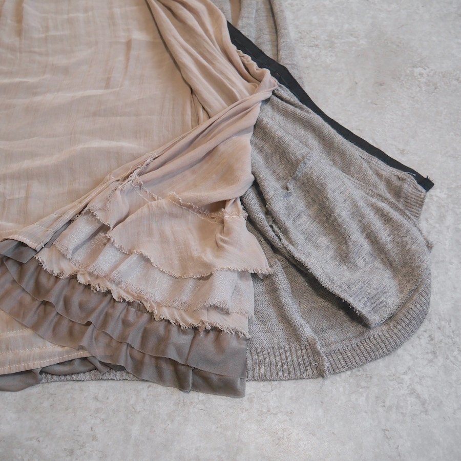 ヤエカのロングカーディガンです。 首元はシースルーになっています。 また、裾にオーガンジー素材のフリルが施されていて時々チラッと覗いたりします。 ボタンホールに対して、ボタンは一つのみで留める場所によってアシンメトリーっぽく着ていただける面白いデザインです。