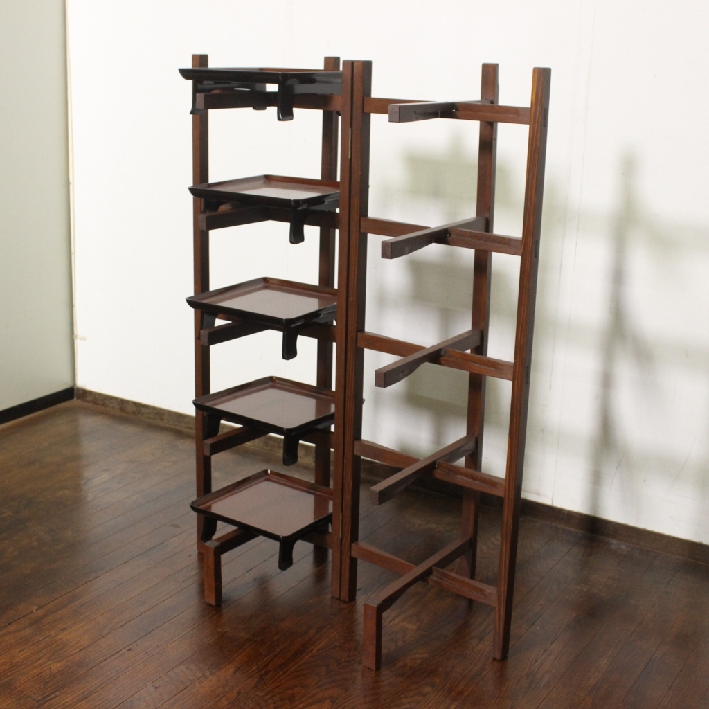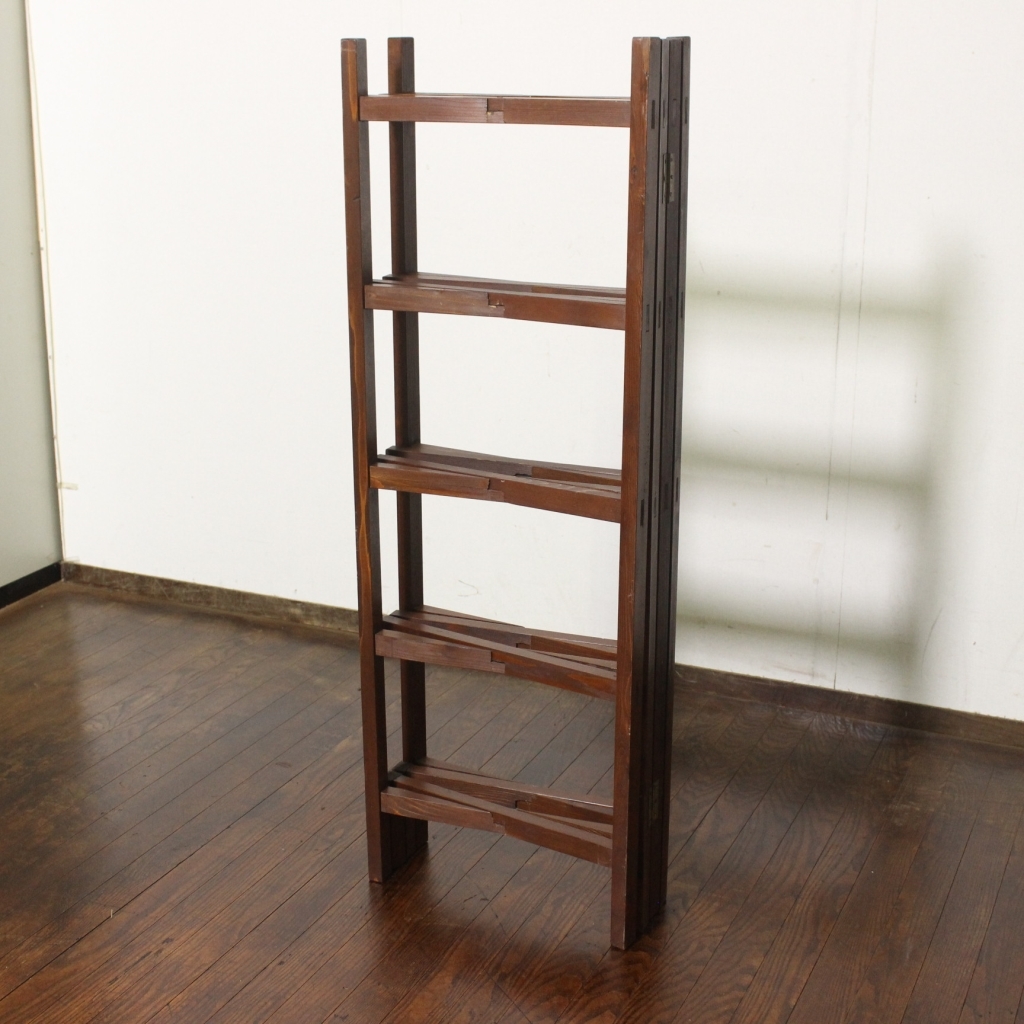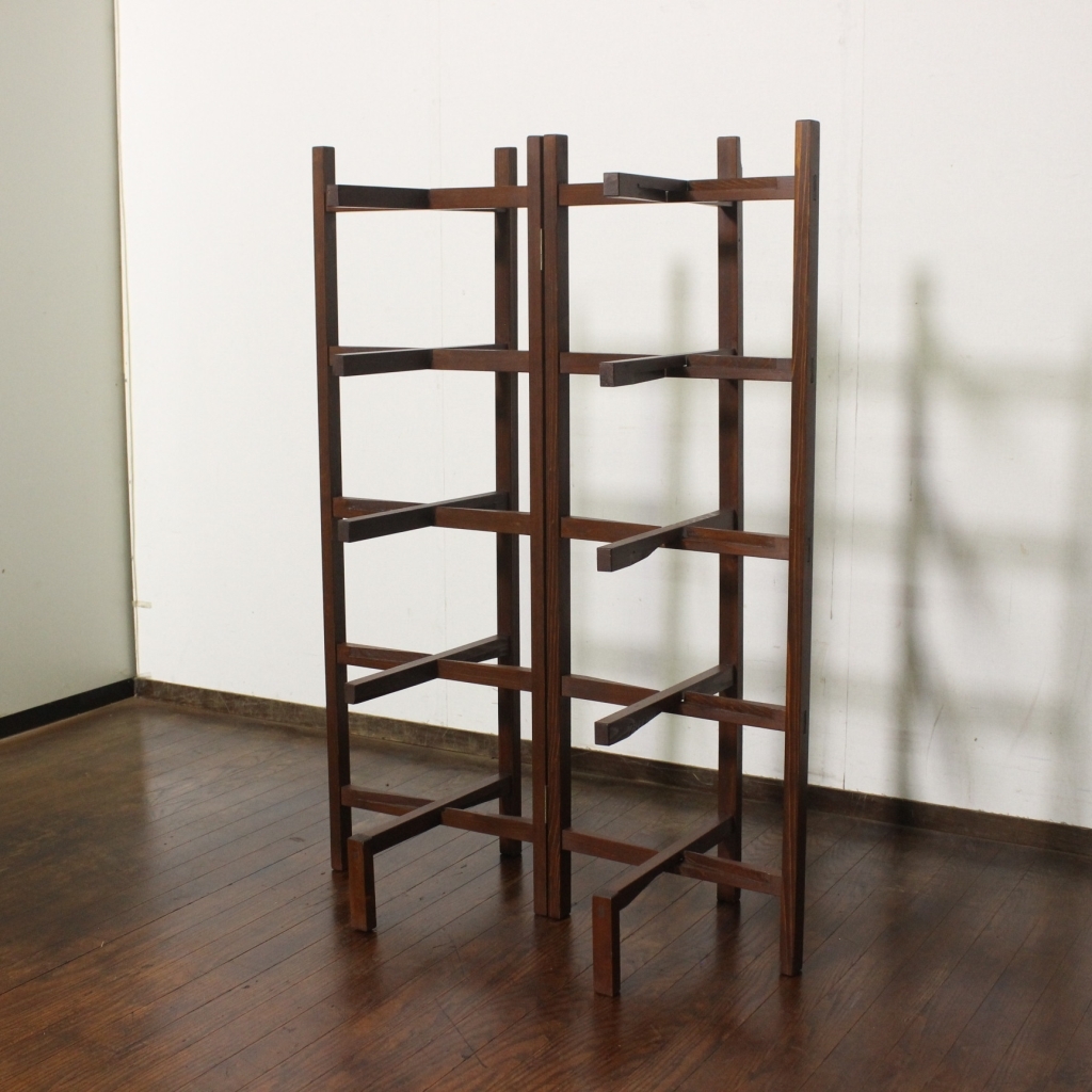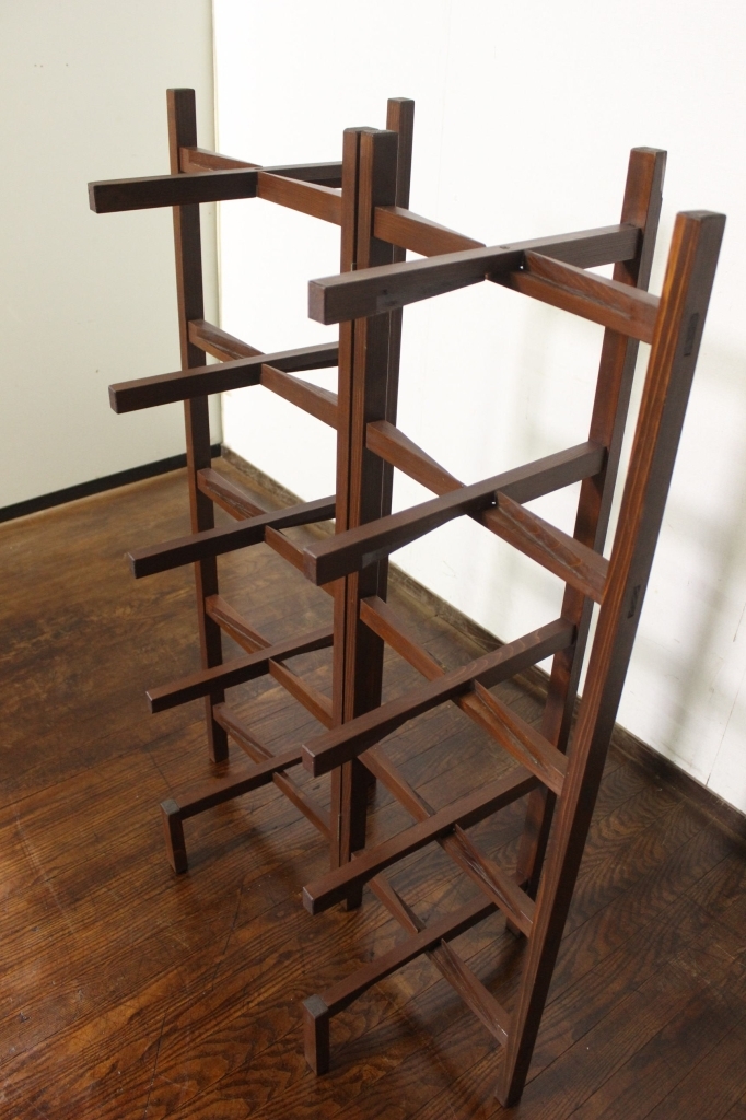 使い込まれたレトロな味のある質感、 お膳を置くのに使用された折畳みタイプの陳列棚。 無垢板などを棚板としてご用意しご利用下さい。 折り畳めるので小スペースでも使い勝手良いのではないでしょうか。 ご家庭での実用はもちろん、レトロな趣のインテリアとして、 店舗での飾り棚やディスプレイなどにもオススメです。 お膳は付属いたしておりません。 |
