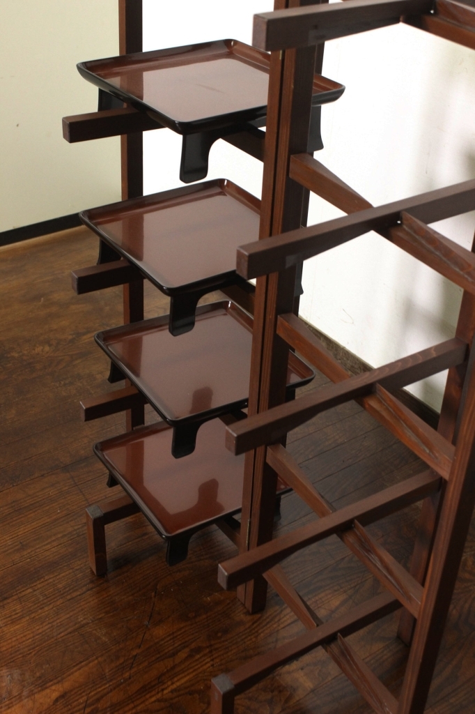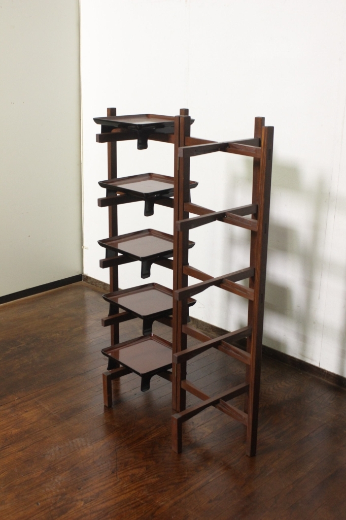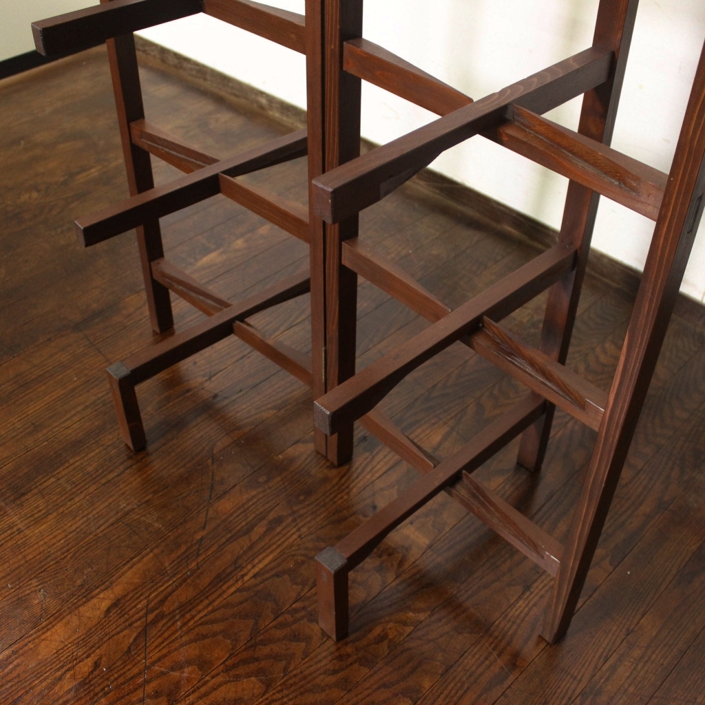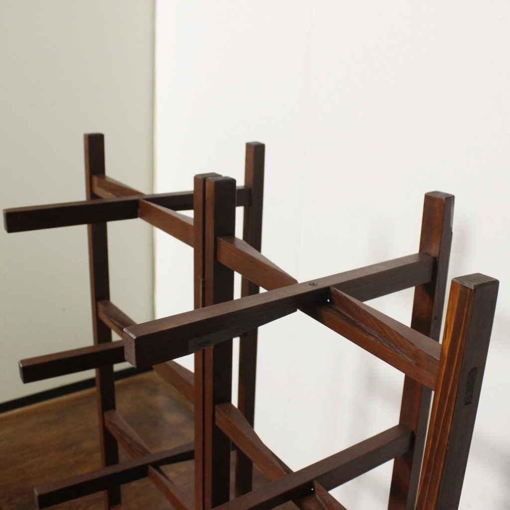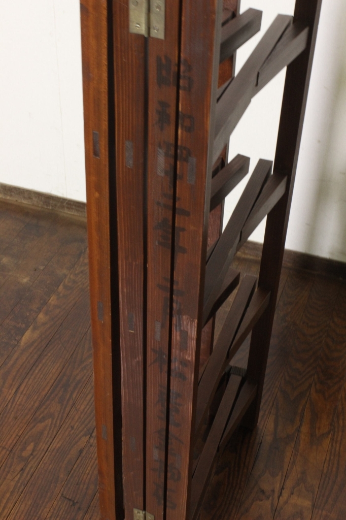 使い込まれたレトロな味のある質感、 お膳を置くのに使用された折畳みタイプの陳列棚。 無垢板などを棚板としてご用意しご利用下さい。 折り畳めるので小スペースでも使い勝手良いのではないでしょうか。 ご家庭での実用はもちろん、レトロな趣のインテリアとして、 店舗での飾り棚やディスプレイなどにもオススメです。 お膳は付属いたしておりません。 |