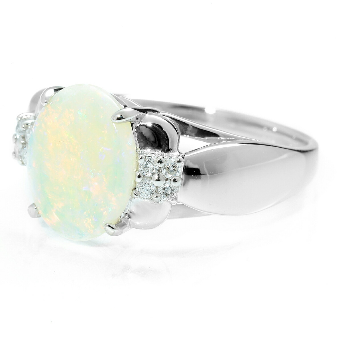 様々な色彩がまるで戯れるかのように輝きながら、虹色のプリズムを作り出す美しいオパールをセッティングしたプラチナリング。サイドには8石のダイヤモンドが添えられ、レインボーに輝く上質なオパールと、ダイヤのきらめきがマッチし、華やかな手元を演出してくれます。