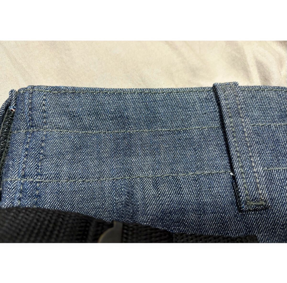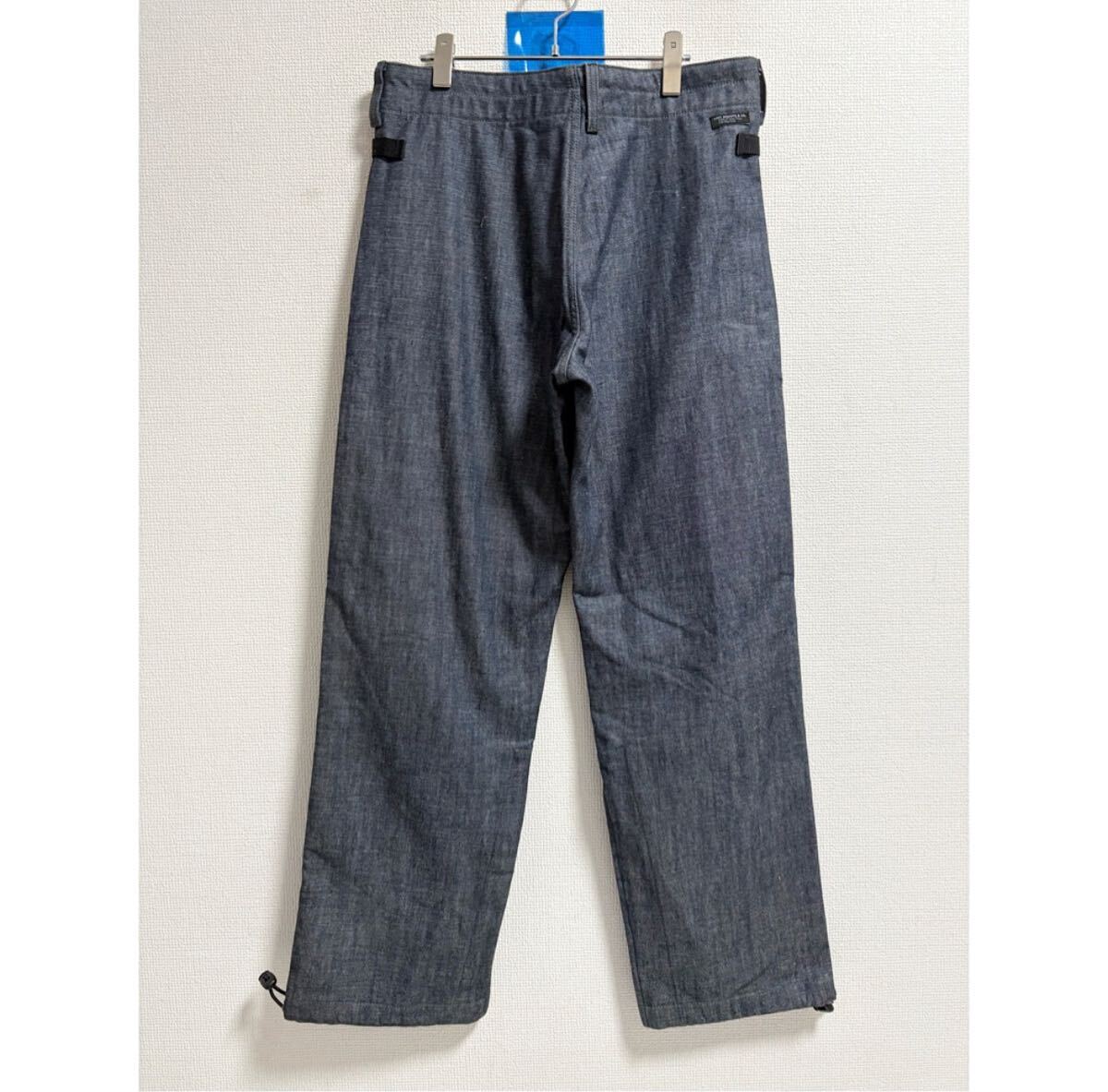 ビンテージ フランス軍のデニムパンツの様な少しだけ紫が入った濃紺 ウエスト3連ステッチや、所々のステッチの色味もセージグリーンで効いています