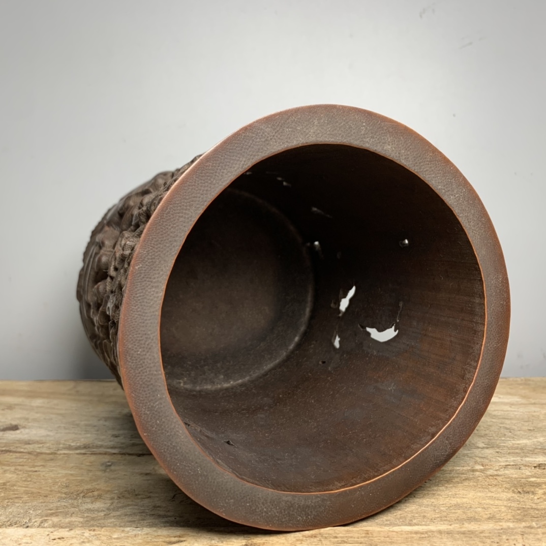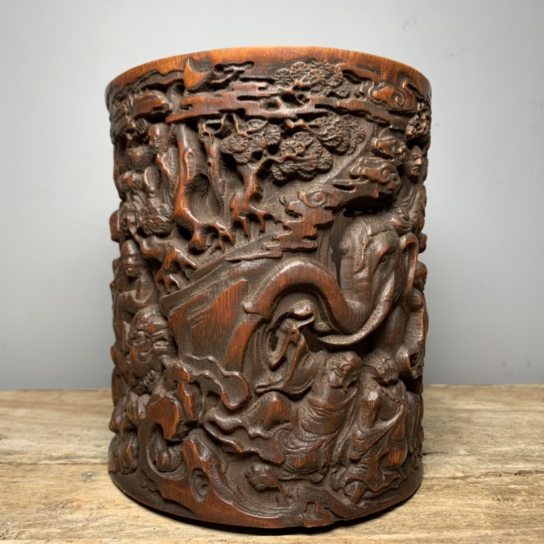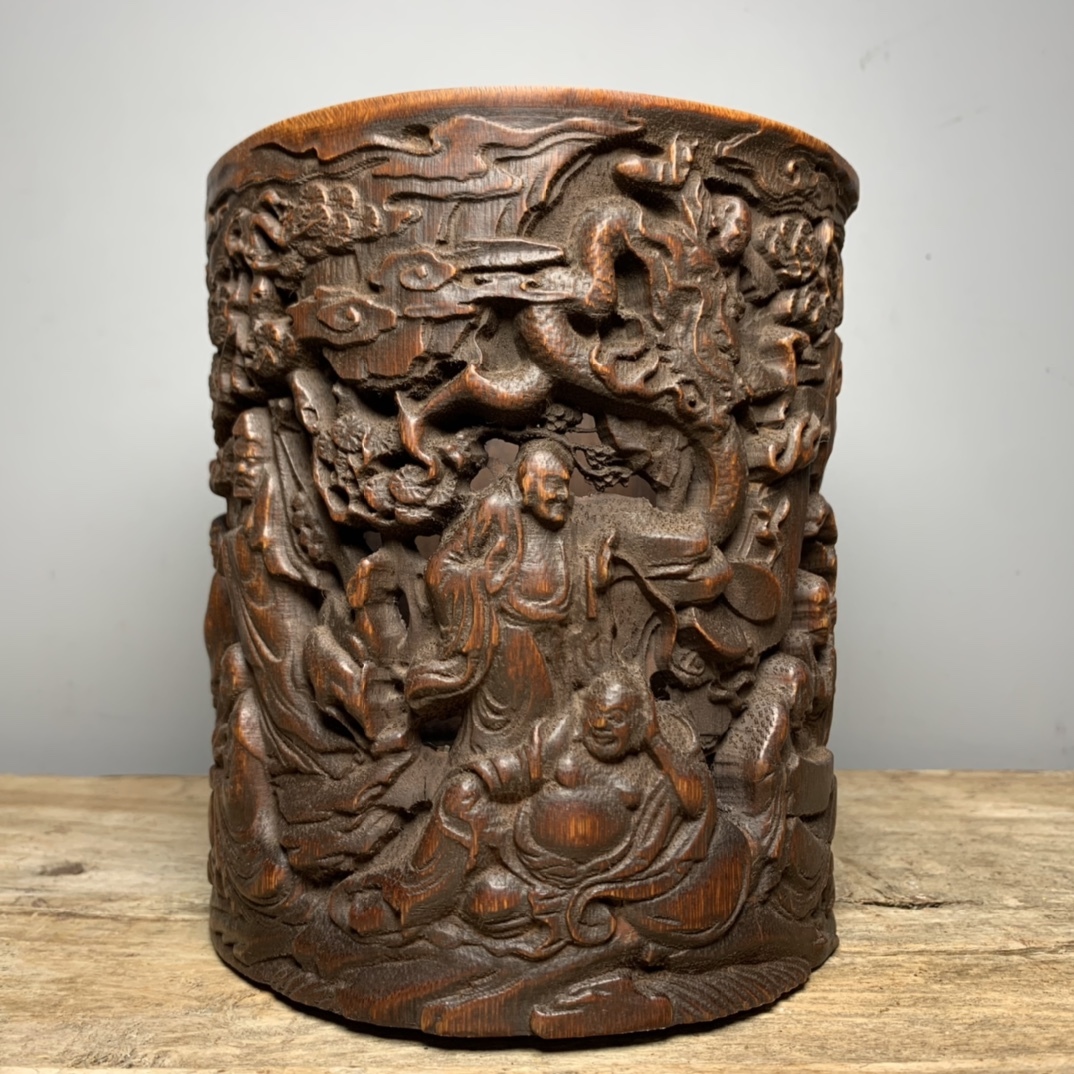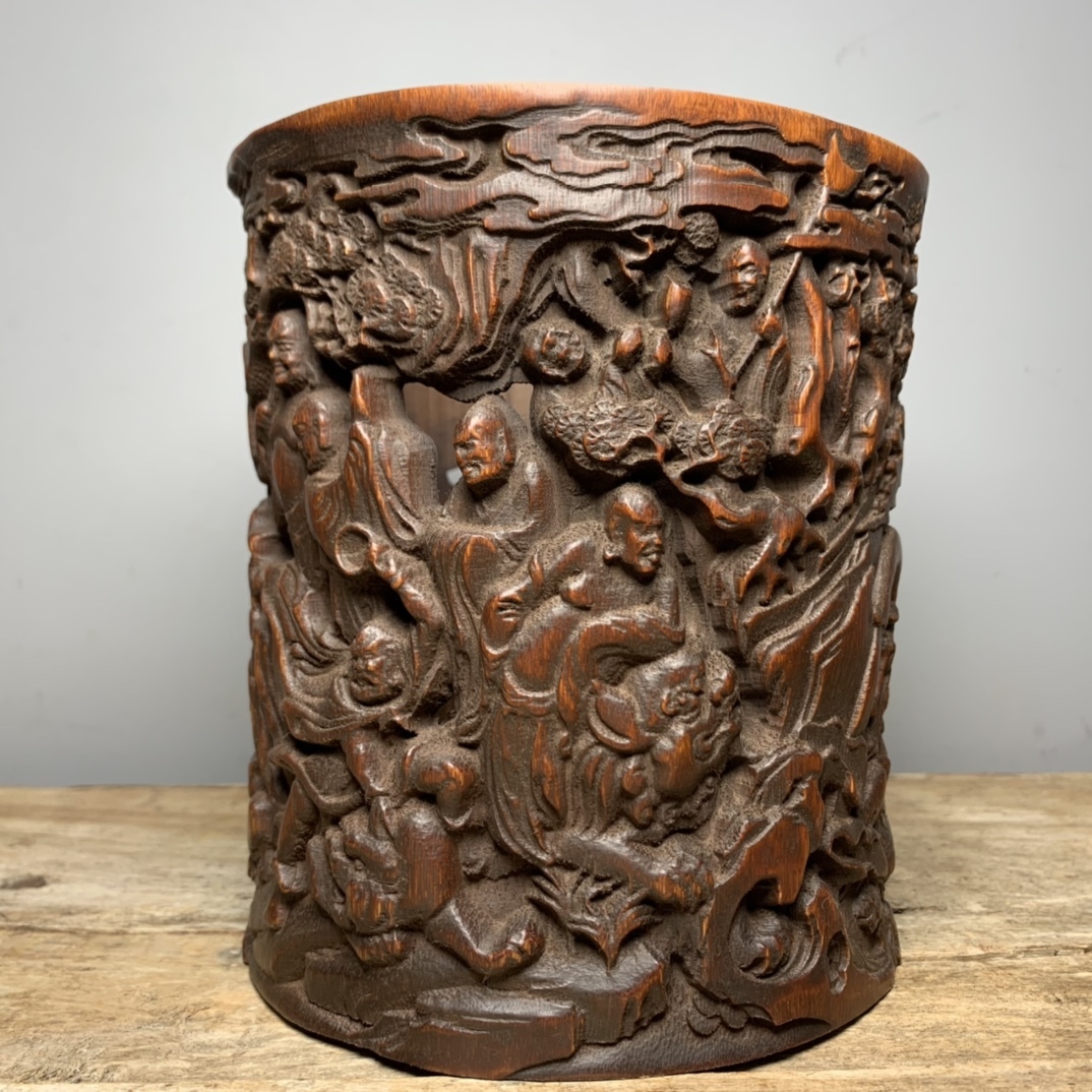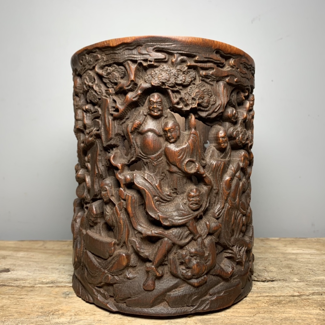 旧藏 中国 清代 古木彫 十八羅漢 筆筒 文房具 細密毛彫 時代物 中国古美術 極細工 置物 木彫り 東洋彫刻 唐物 S75