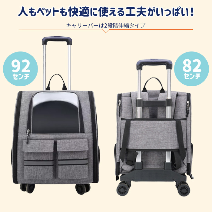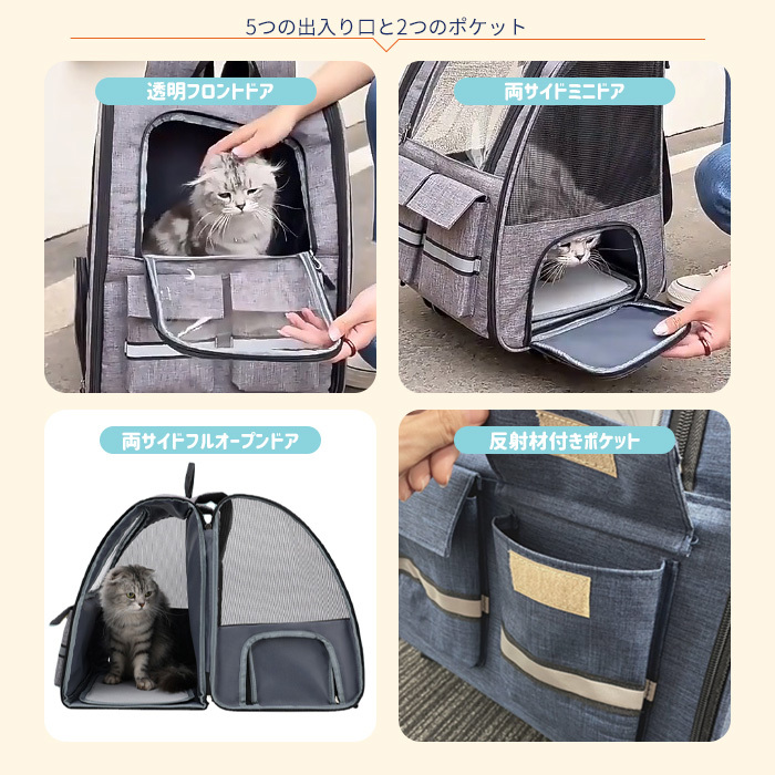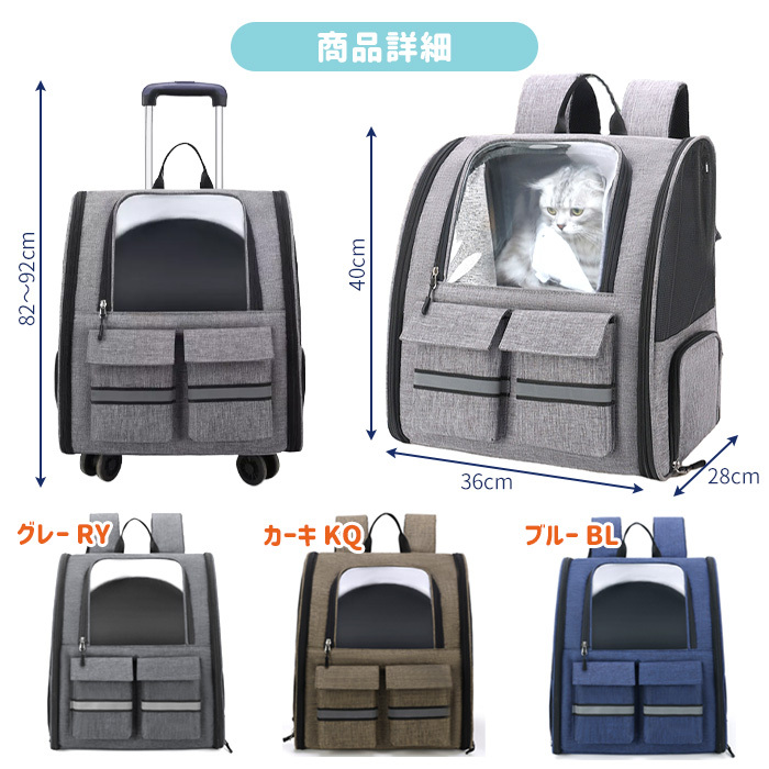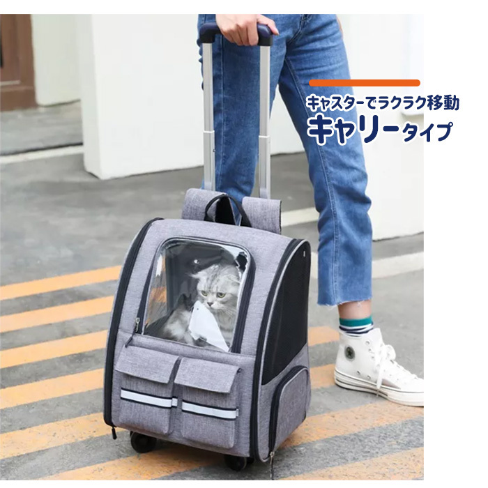 ペットキャリー リュック キャリー 2way 移動 コンパクト 軽量 安全 快適 透明ドア 収納 ミニドア フルオープン 散歩 旅行 ドライブ 防災 小型犬 中型犬 猫 グレー カーキ ブルー ポケット 折りたたみ"