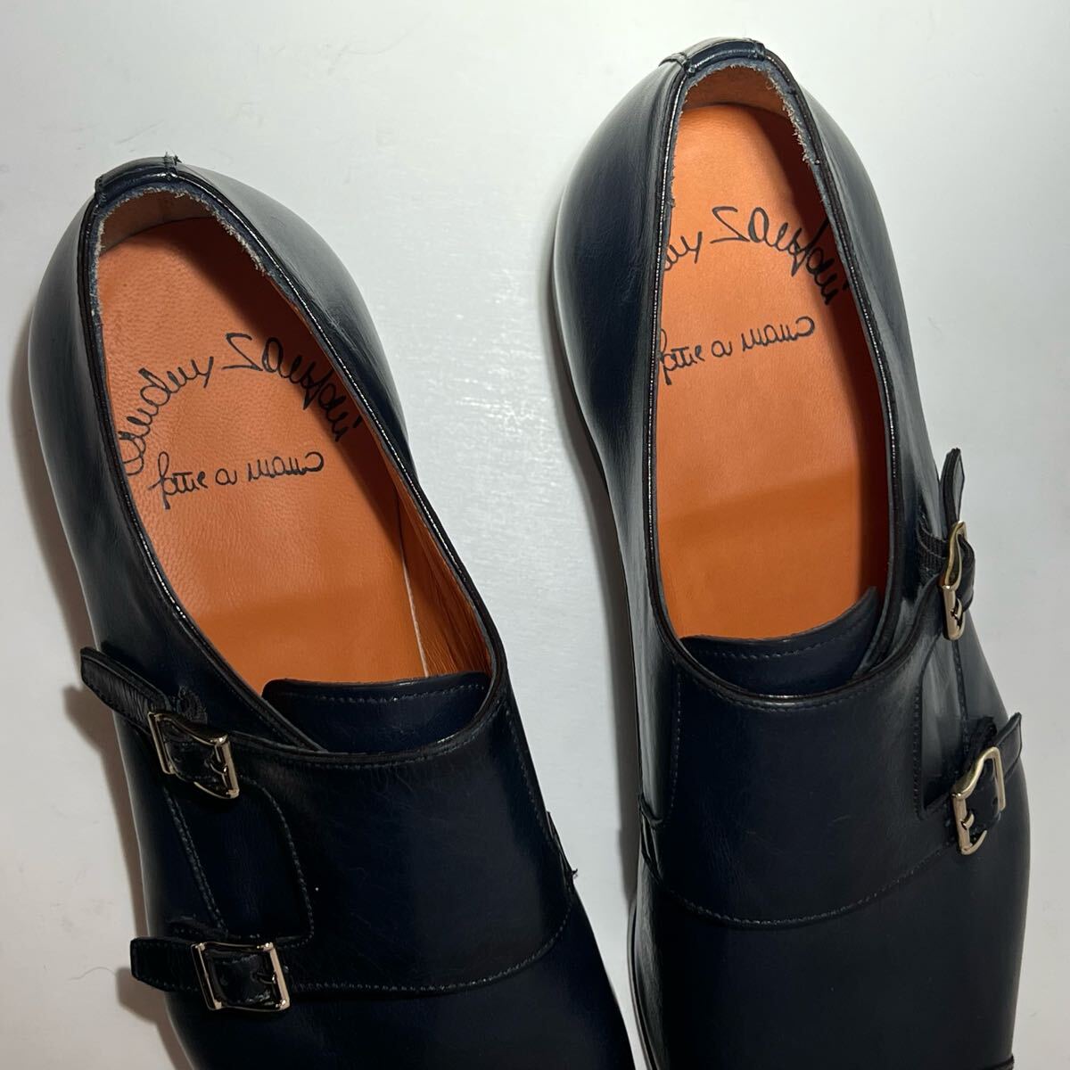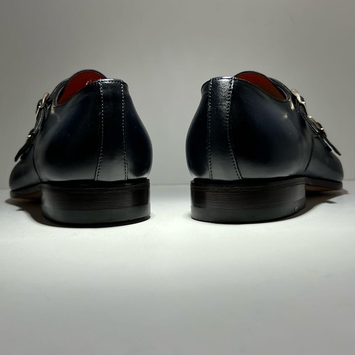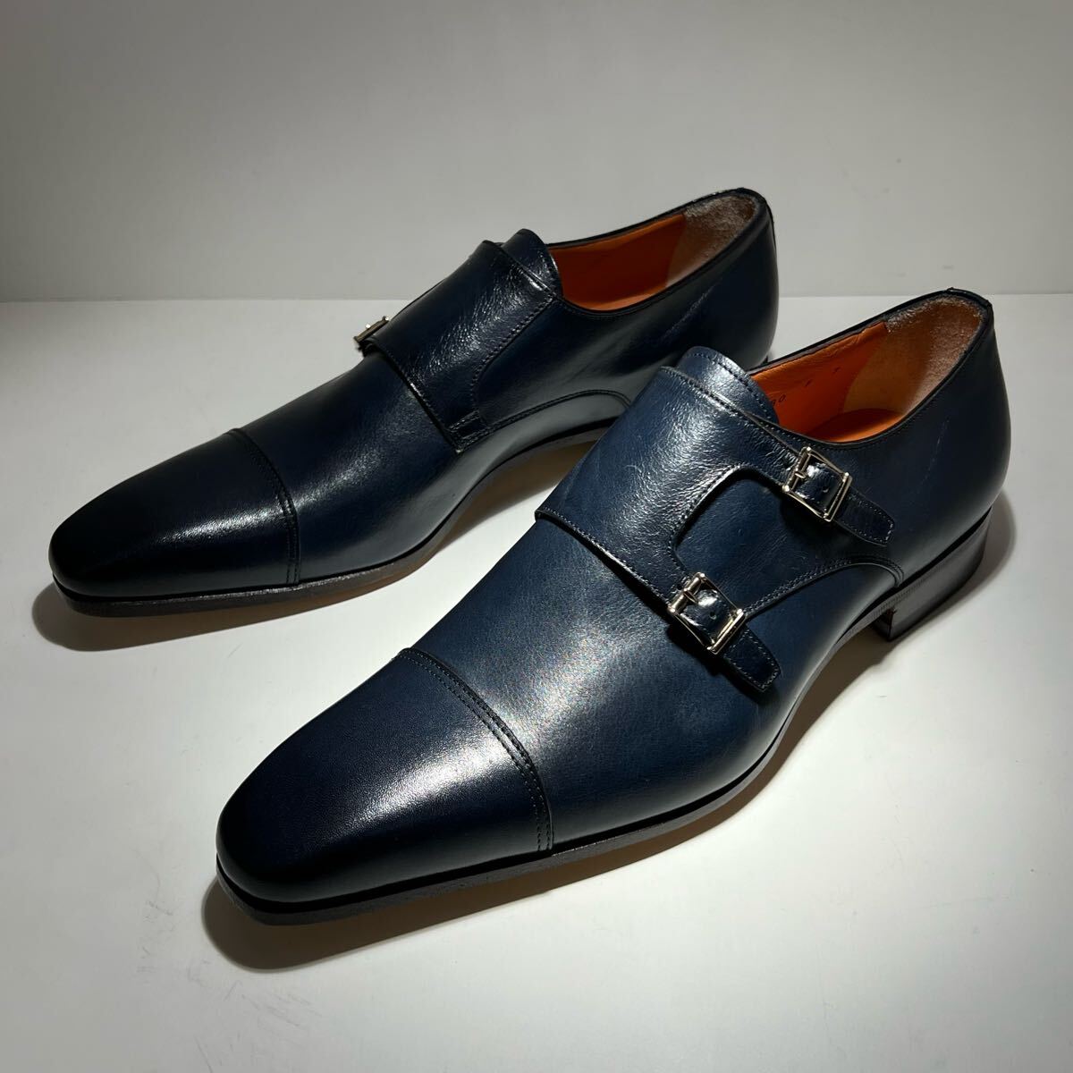 濃青のダブルモンクのストレートチップで、小さめの金具やシャープなラストが目を引くお品物です。アッパーの素材は、流通量の少ない高品質のカンガルーレザーで、薄く軽いのに強度もある実用的な素材となります。ドレス寄りのデザインですので、パーティー、ややカジュアルなシーンでの装いと相性が良いです。