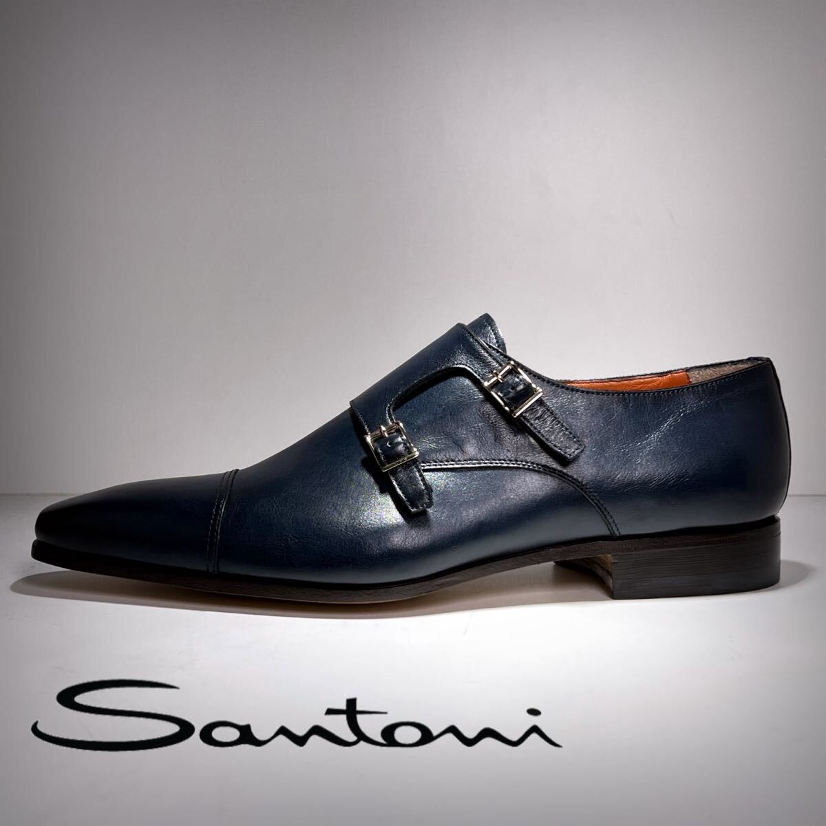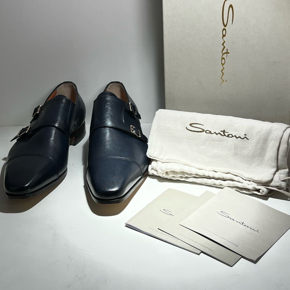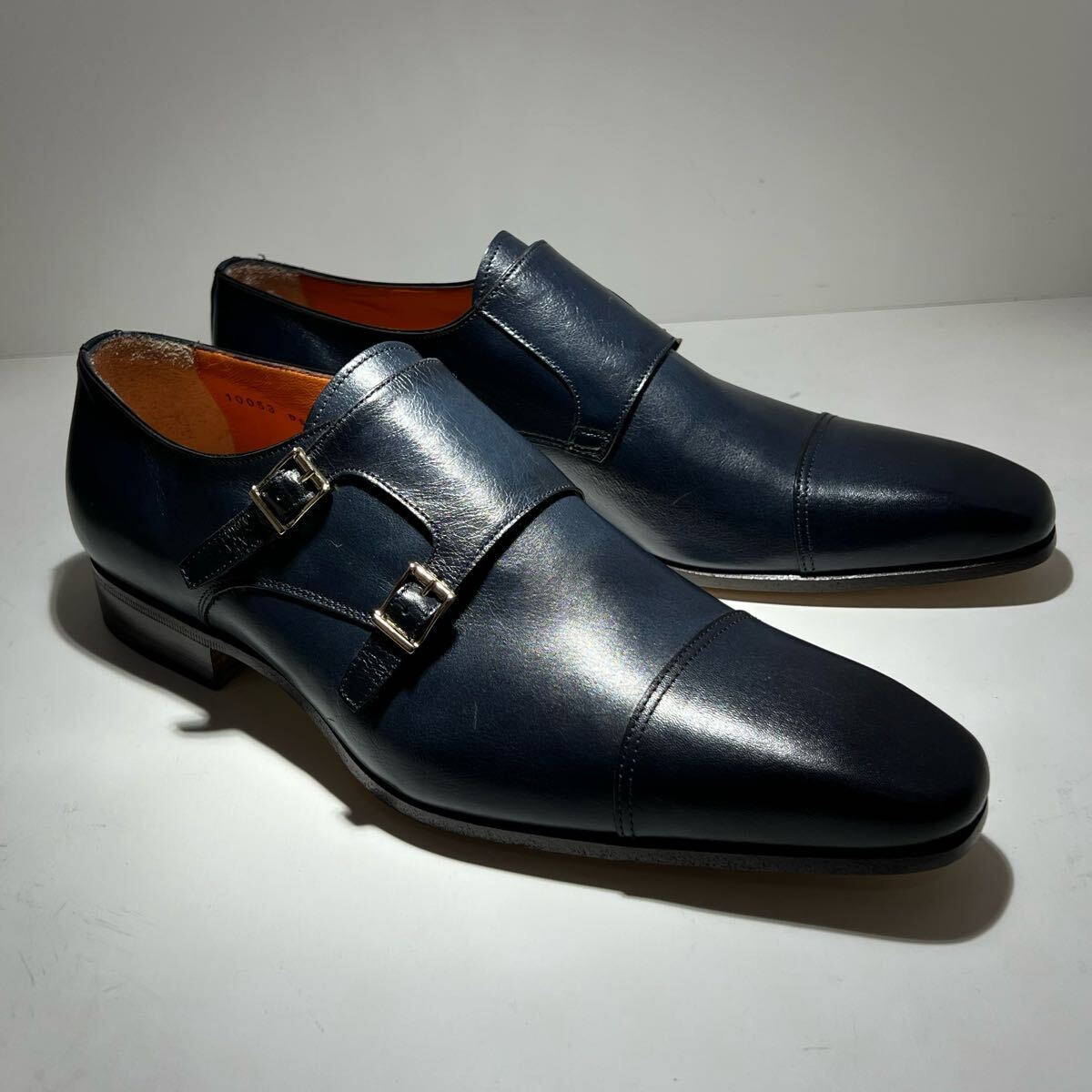 濃青のダブルモンクのストレートチップで、小さめの金具やシャープなラストが目を引くお品物です。アッパーの素材は、流通量の少ない高品質のカンガルーレザーで、薄く軽いのに強度もある実用的な素材となります。ドレス寄りのデザインですので、パーティー、ややカジュアルなシーンでの装いと相性が良いです。
