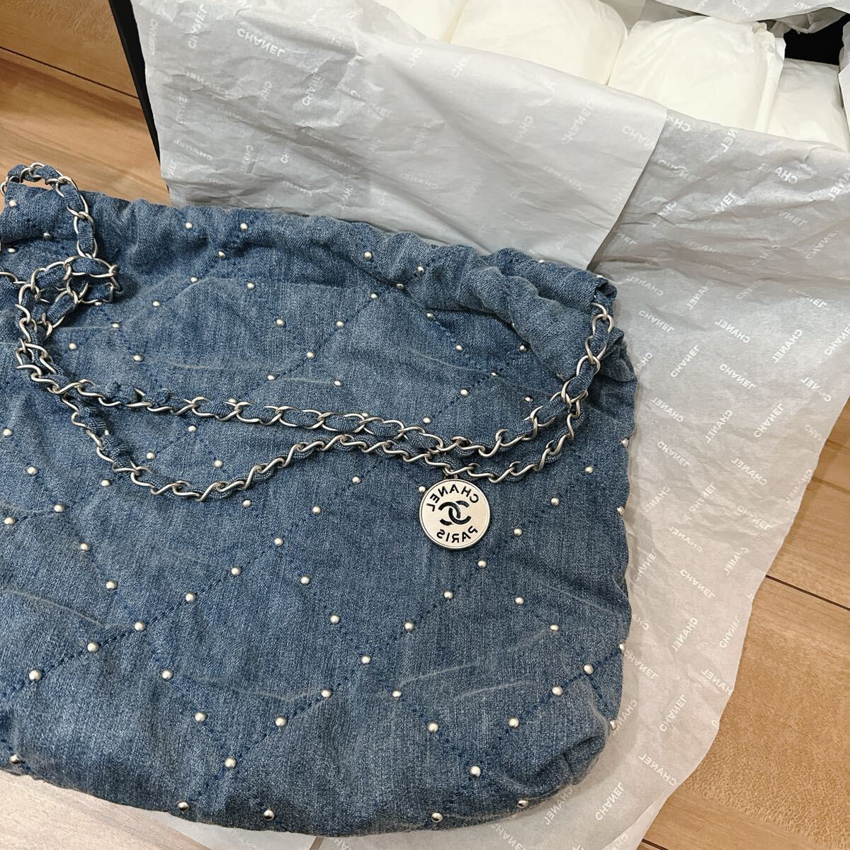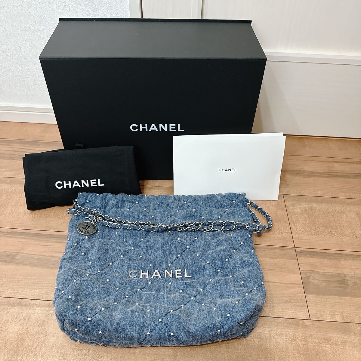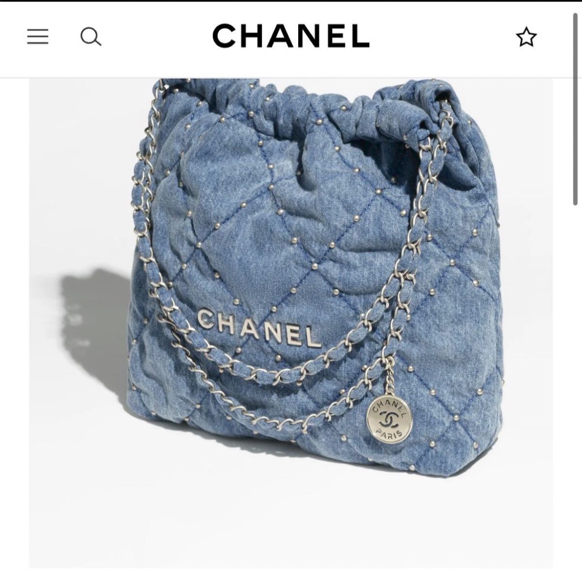 2022年発表された新ライン「CHANEL 22」。 ヴィルジニーヴィアールによってデザインされた、アイコニックなバッグです。 ウォッシュドデニムにパールのようなスタッズが目を惹く逸品です。