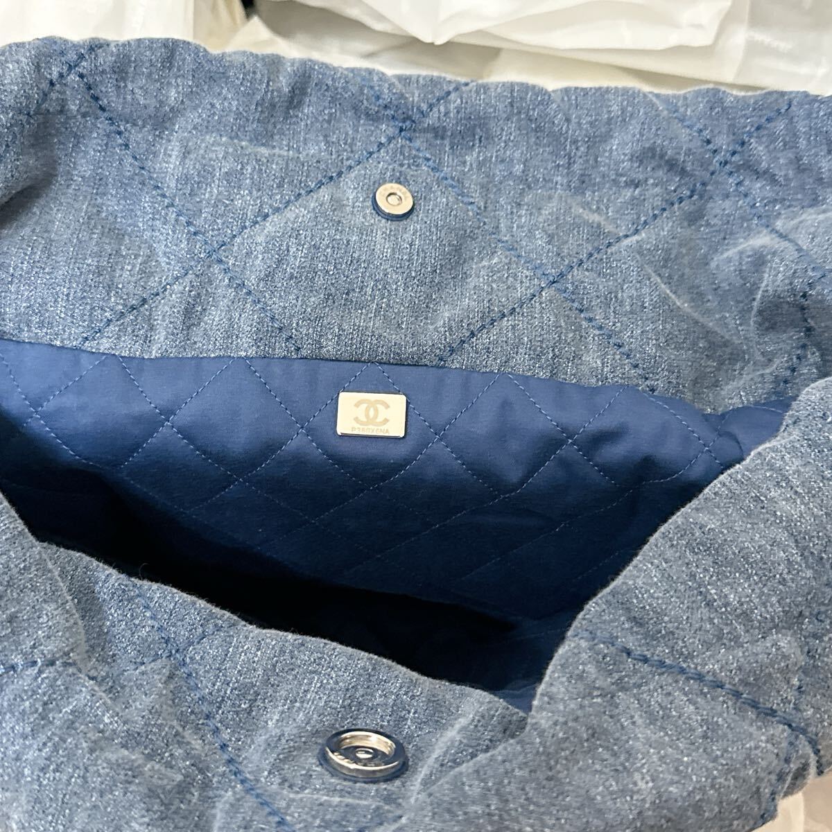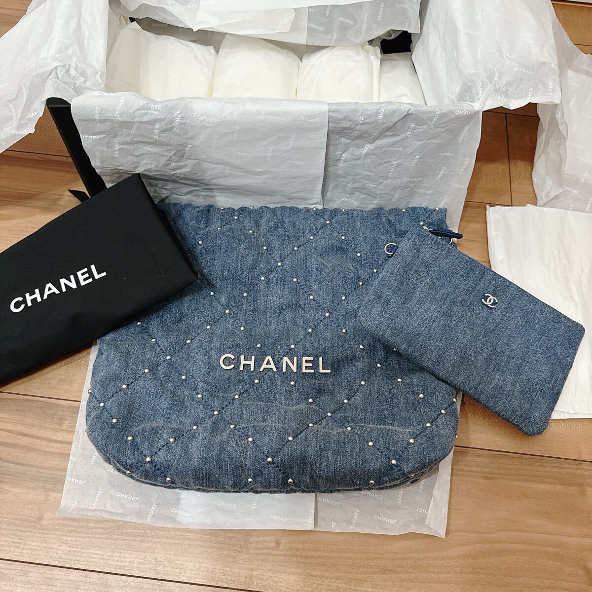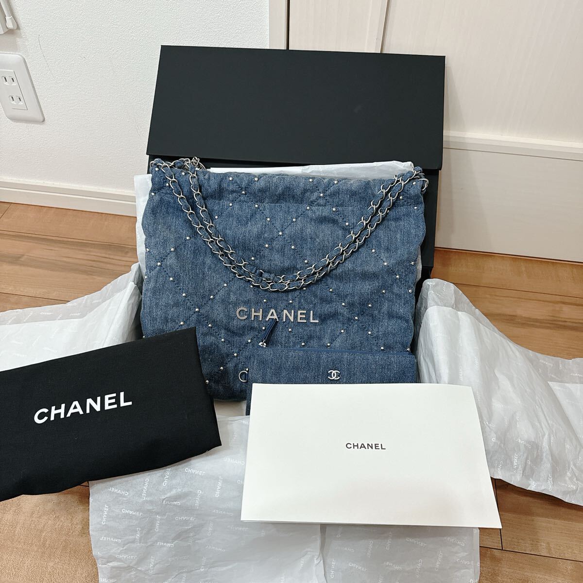 2022年発表された新ライン「CHANEL 22」。 ヴィルジニーヴィアールによってデザインされた、アイコニックなバッグです。 ウォッシュドデニムにパールのようなスタッズが目を惹く逸品です。
