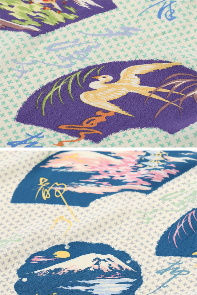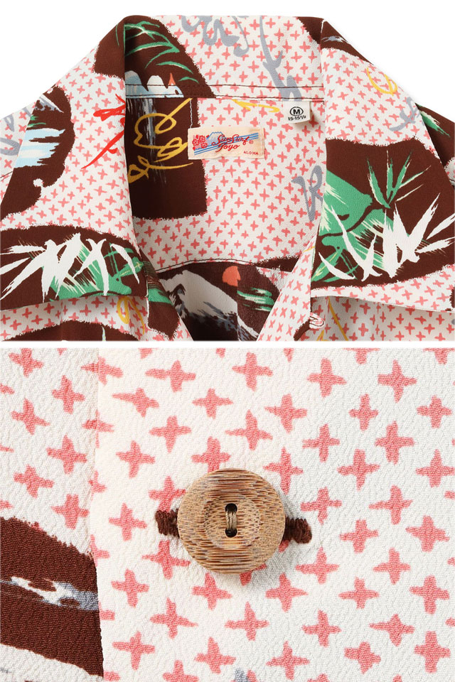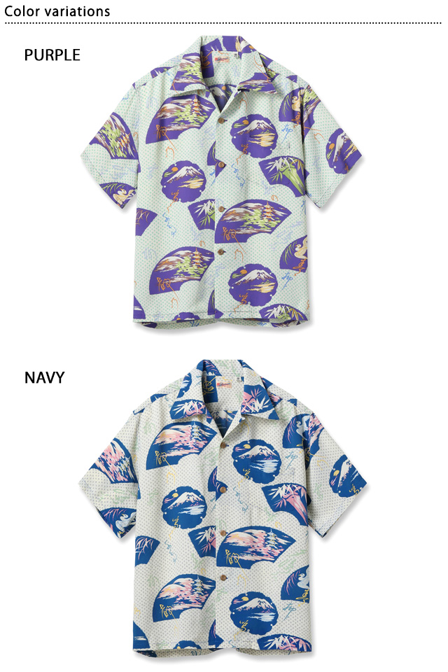 アロハシャツの黄金時代とされる1930~50年代にかけて作られた「ヴィンテージ」と呼ばれる貴重なアロハシャツを再現し、現代に蘇らせているブランド「SUN SURF」から、レーヨンアロハシャツ「JAPANESE TRADITION」(SS39418)のご紹介です。 絣調のデザインを敷き詰めたグランドが特徴的な作品で、雪輪と呼ばれる雪の結晶を表現した中に、富士山などのモチーフが描かれた柄を構成したオリエンタルな一枚。 古くから着物の模様としても使われている雪輪は雪解け水を意味し、豊作を願うモチーフとして日本でデザインされたアロハシャツにも使われてきました。 このシャツの中には、京都の大文字焼きの風景などのほかにも、常夏の島ハワイに合わせて夏の季語である白鷺も描かれ、工夫を凝らした柄となっています。 ボディーには、てろんとしたレーヨン壁縮緬生地を採用。 アロハシャツは、生産も非常に少なく、レアなアイテムとなっています。 | ||||||||||||||||||||||||||||||