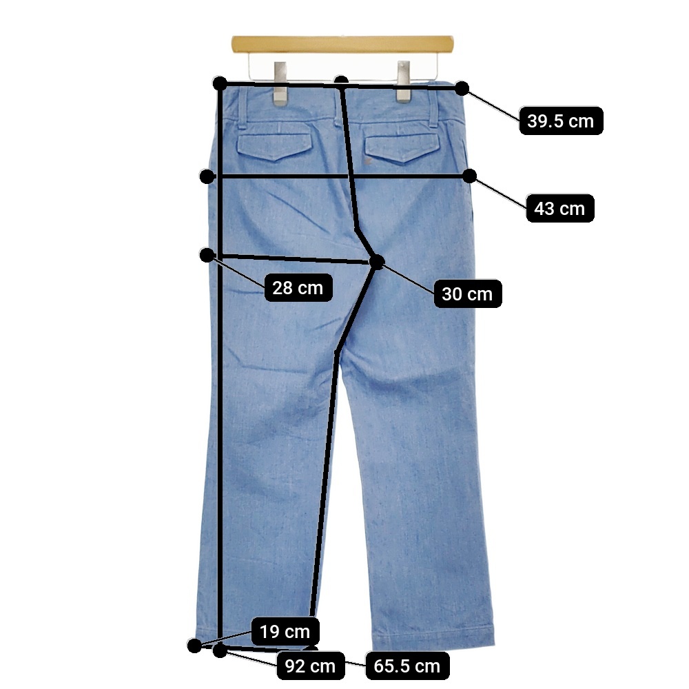 実寸サイズ | 総丈:約92cm ウエスト:約39.5cm 股上:約30cm 股下:約65.5cm ヒップ:約43cm ワタリ幅:約28cm 裾幅:約19cm ※記載以外のサイズが合わないことを理由とした返品はできませんので、 記載部分以外で実寸サイズの気になる箇所があれば必ず購入前にご質問ください。 |
