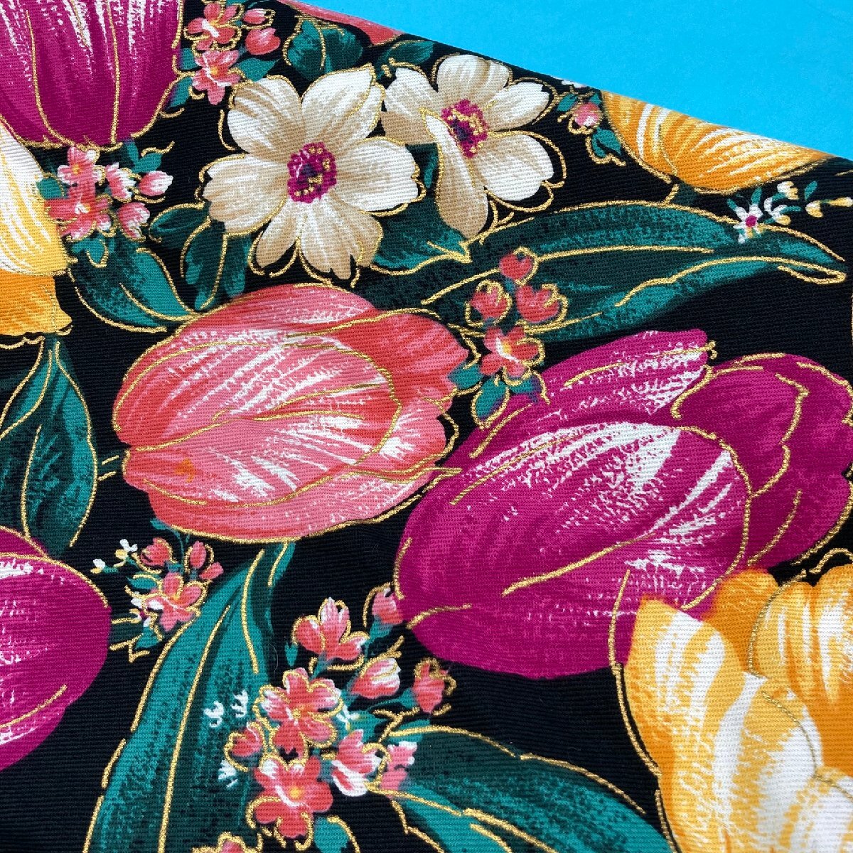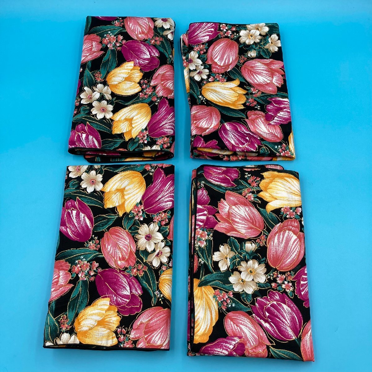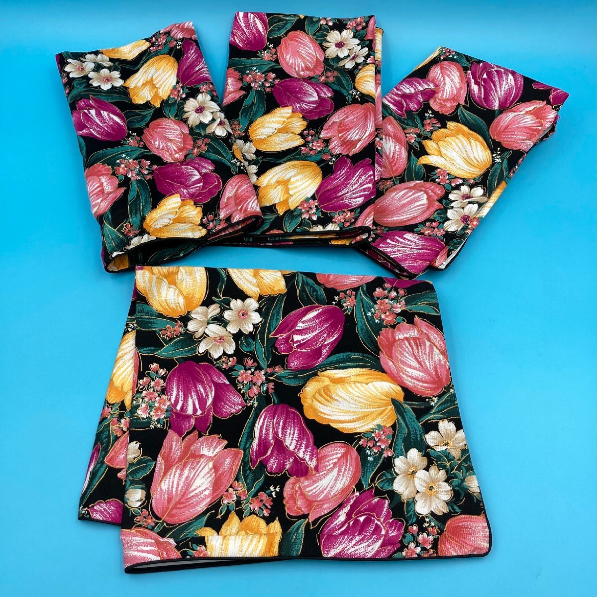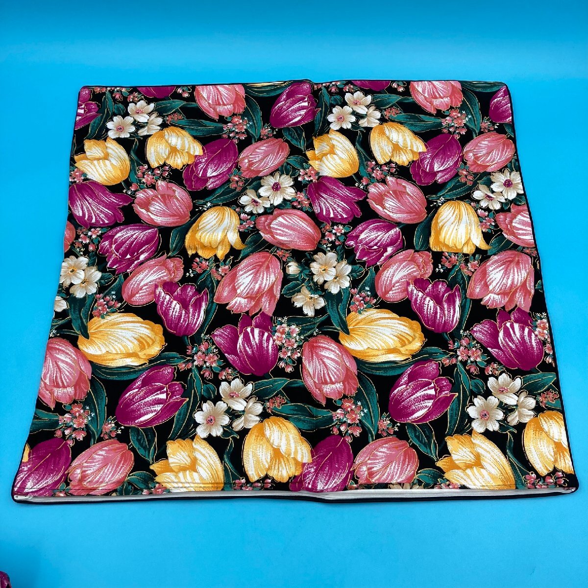 【17555Q026】座布団カバー 銘仙判 花柄 チューリップ? 4枚セット 黒地 チャック ファスナータイプ クッションカバー インテリア レトロ