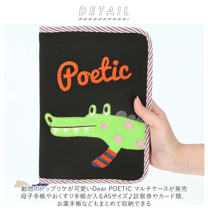 | 商品説明 | ・・動物のアップリケが可愛いDear POETIC マルチケースが発売。 ・母子手帳やおくすり手帳が入るA5サイズ♪診察券やカード類、お薬手帳などもまとめて収納できる。 ・開いて左側にオープンポケット×1、中が見えるメッシュ素材のファスナーポケット、ペンホルダー。右側にオープンポケット×1、カード入れ×8、ファスナーポケット×1装備。 ・シンプルながら細部まで行き届いたつくりで、クッション性があり持ちやすい。 ・通院、健診用だけでなく通帳やクレジットカードを入れて家計を管理するグッズをまとめたり、海外旅行でのパスポートケースなど色々な使い方ができる! |