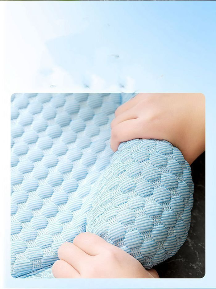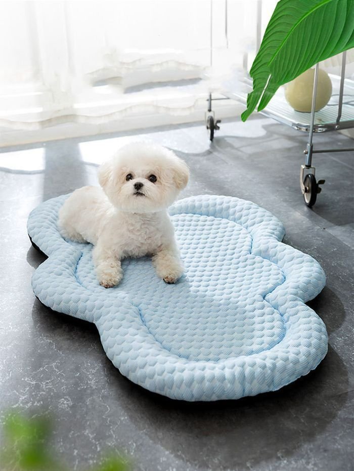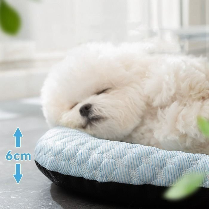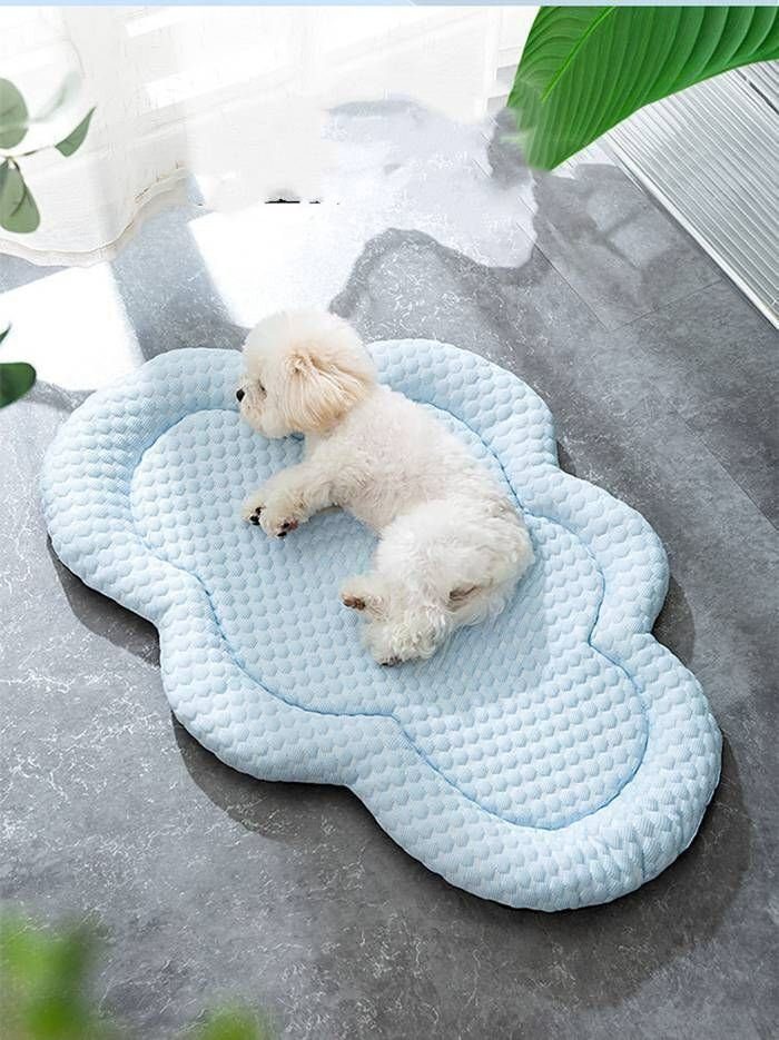 カラー:ブルー サイズ: M M:65*45cm(薦め体重:7.5kg以内) 犬や猫の熱中症及びクーラー病防止のため、座面は 夏の寝具と同じ品質の接触冷感生地を採用しました。肌が生地に触れた瞬間、ひんやりが感じる素材で、ご愛犬は蒸し暑い夏を快適に過ごせます。そして、扇風機などと併用すると、冷感効果はだいぶアップになりますし、電気代の抑えにもなります。