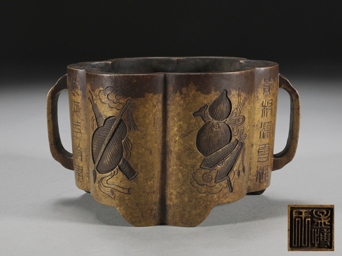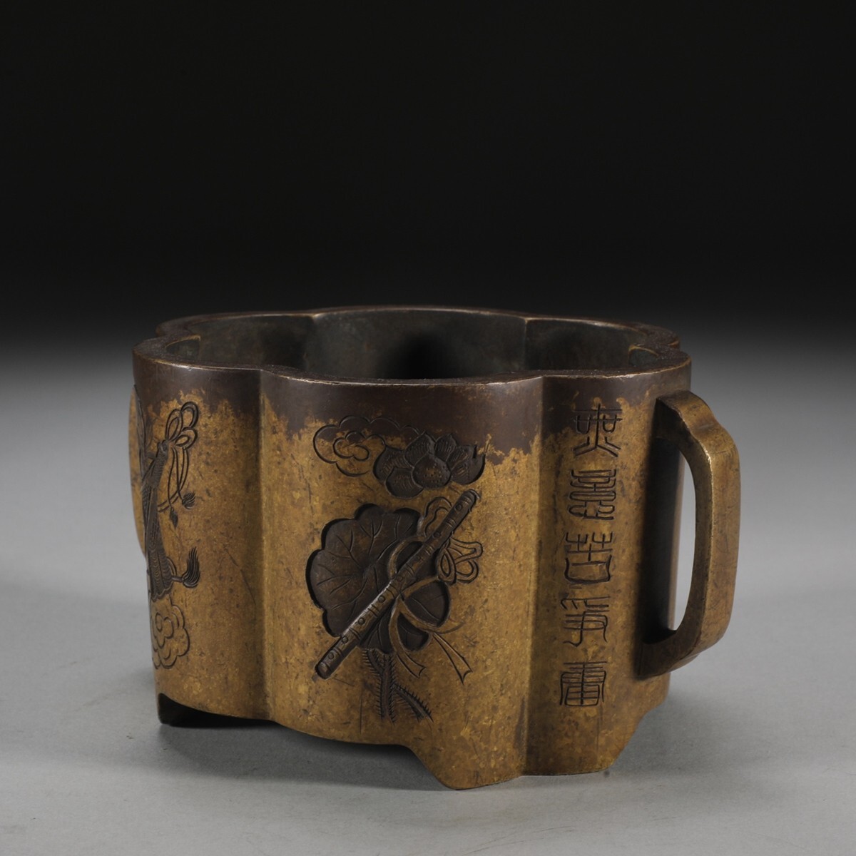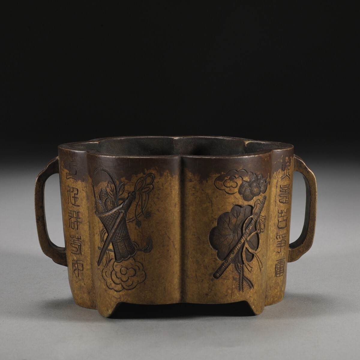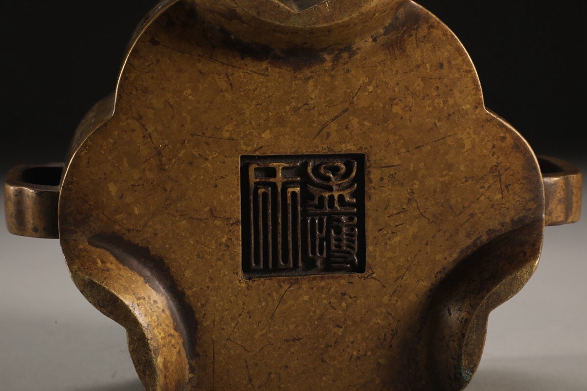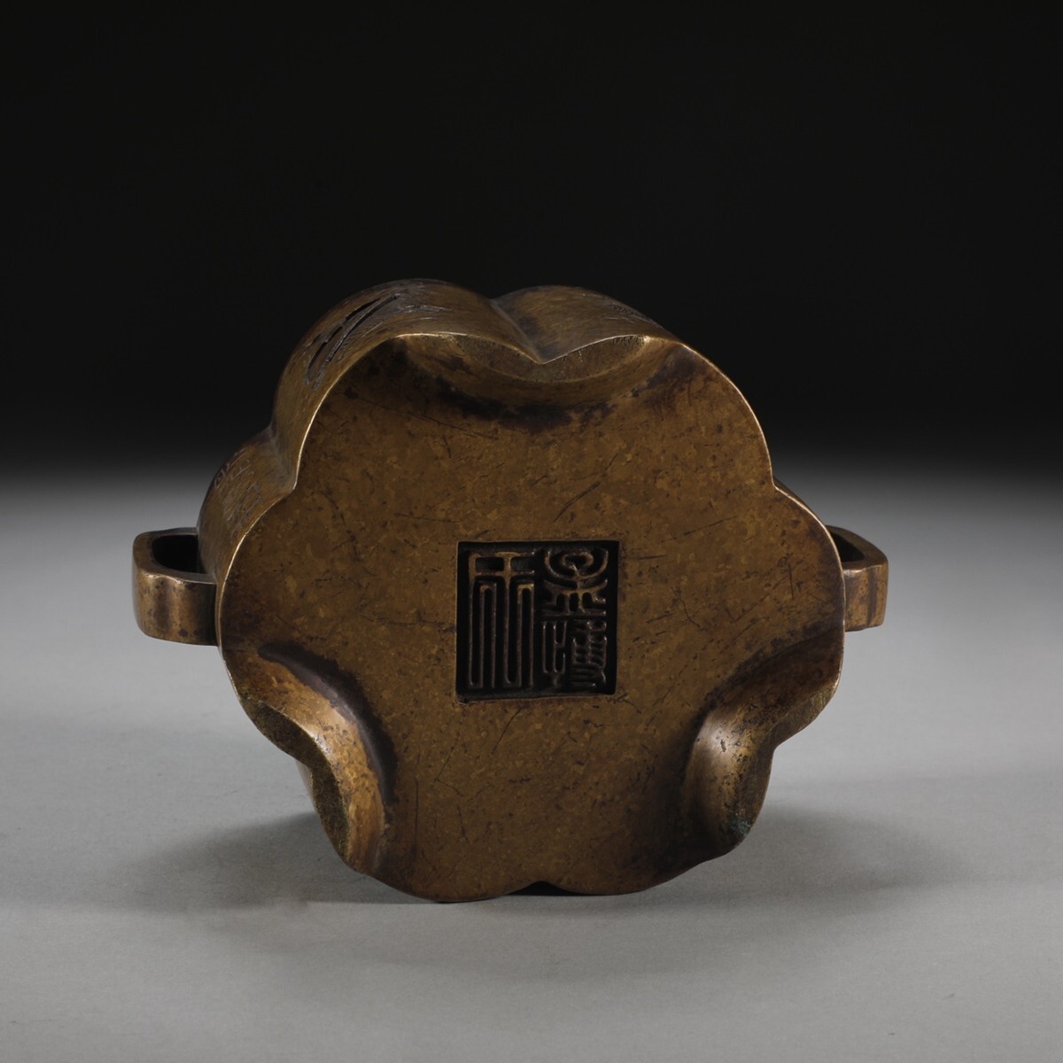 【瓏】古銅鏨刻彫 花瓣如意耳香炉 明時代 孟博氏款 銅器 古美術 骨董品 香道具 蔵出