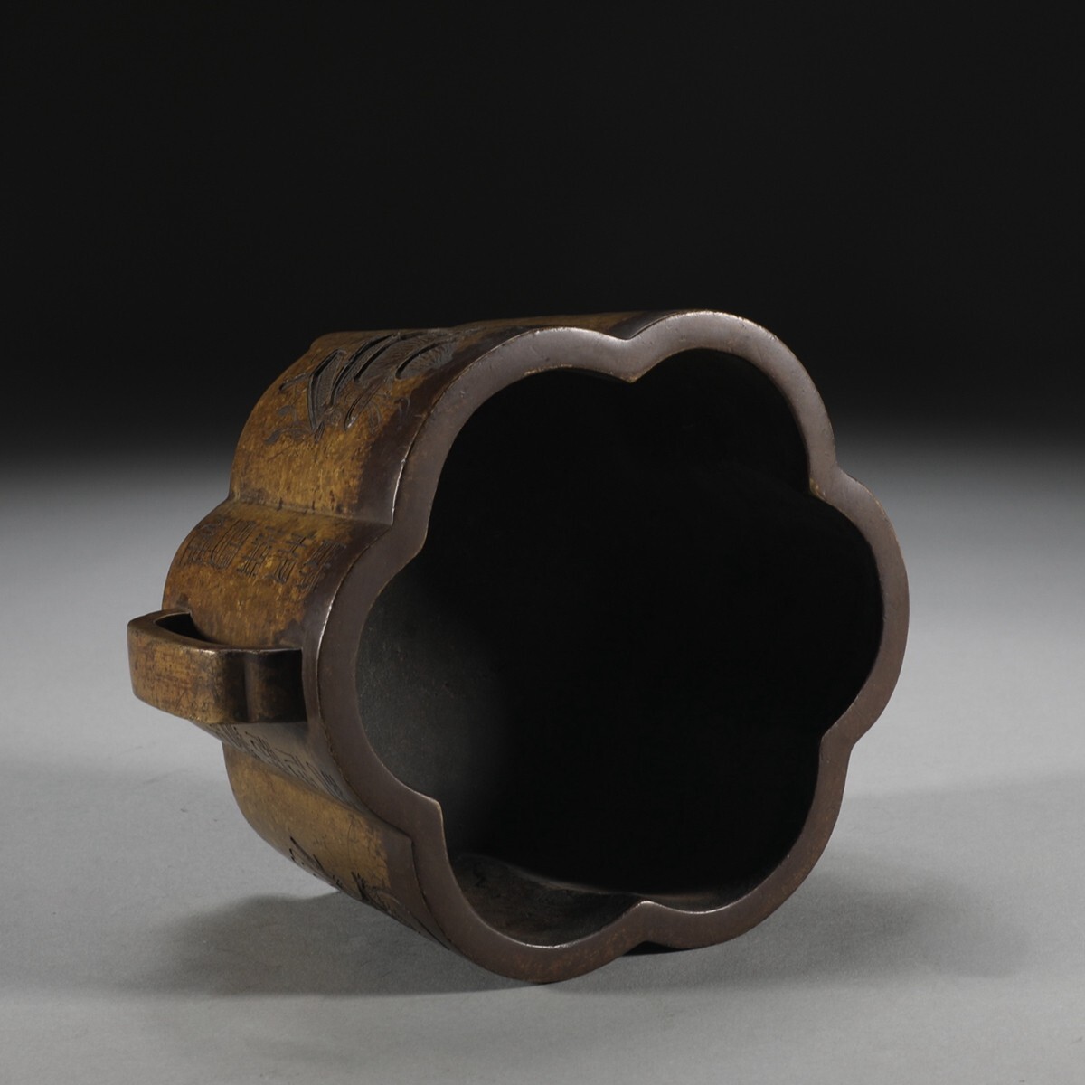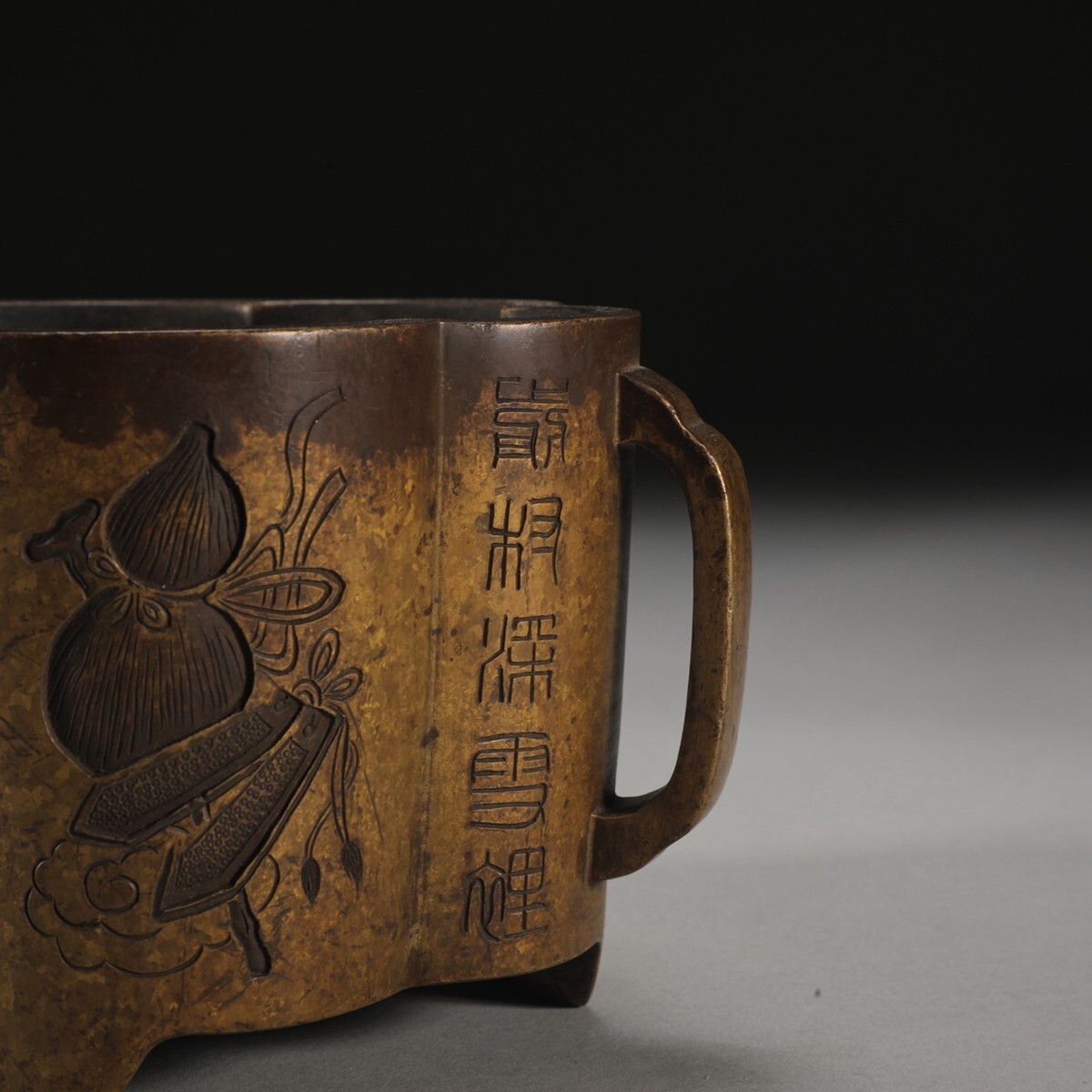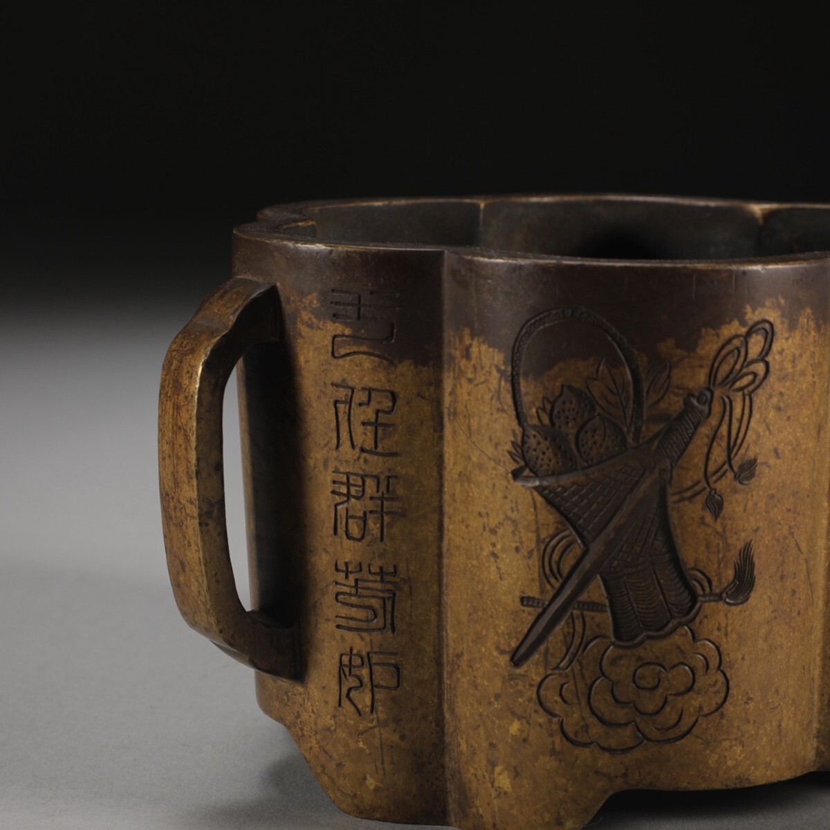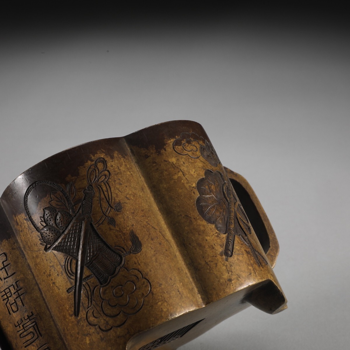 【瓏】古銅鏨刻彫 花瓣如意耳香炉 明時代 孟博氏款 銅器 古美術 骨董品 香道具 蔵出