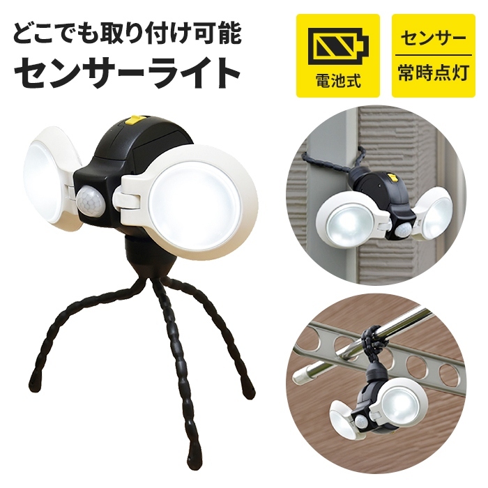 センサーライト ダブル 電池式 乾電池 LED ライト 0.75W 2灯 IP43 防雨 マグネット付き 自由に曲がる三脚 電池式 LED センサーライト 屋外 屋内 2灯 フリーアーム式 自由な配光 広範囲 180°照射 フレキシブルアーム 巻きつけ 吊り下げ スタンド マグネット 便利灯 |