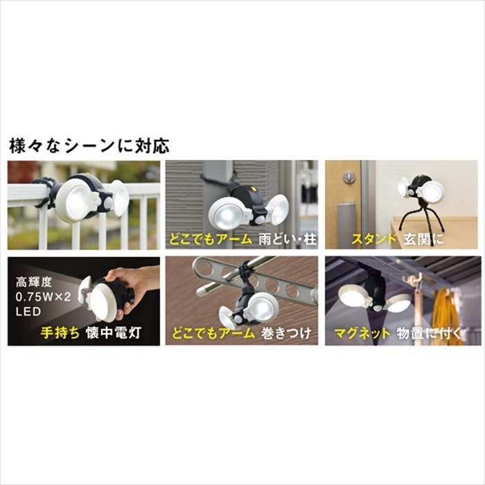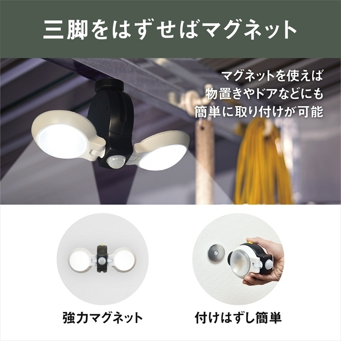 フリーアームでこれまでにない自由な配光。 どこでもセンサーライトダブルです。 ライトの方向自由自在。 防雨タイプ。 近づくとパッと点灯。 センサーで自動消灯。 どこでもアームで雨どい・柱に、スタンドで玄関に、手持ちで懐中電灯に。 照明・防犯・節電など、様々なシーンに対応します。 マグネット(付属)で物置にも設置いただけます。 脱着式三脚付き。 |