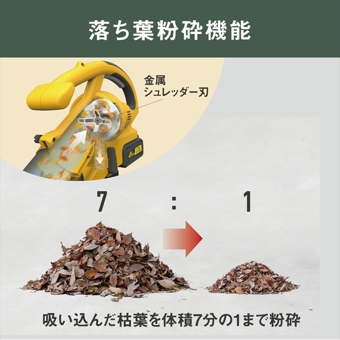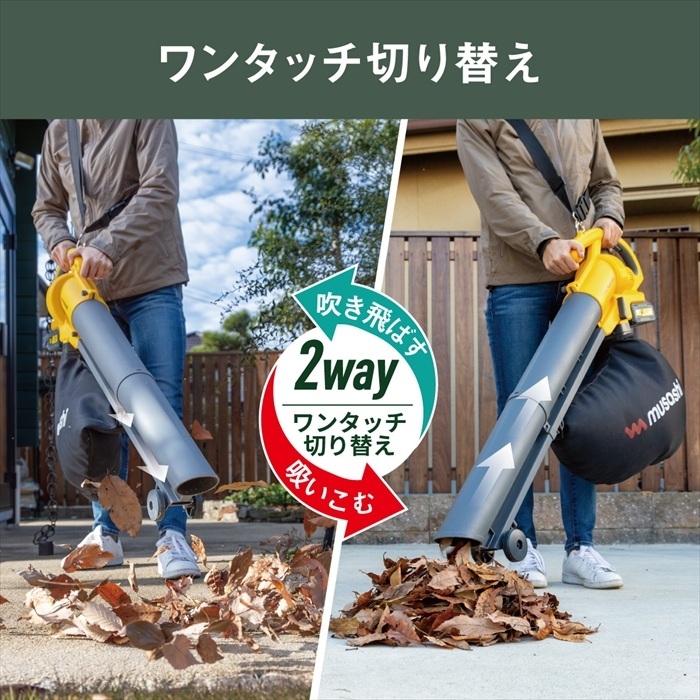 | 吸い込む・吹き飛ばす。 ワンタッチでバキューム(吸引)とブロア(吹き飛ばし)の切替ができる充電式ブロワバキューム。 ブロアで吹き飛ばして集め、バキュームで吸い込む。 作業効率が高くお庭の掃除に革命を起こします。 充電式だからコードレスでどこでも使えて取り回し抜群、パワフルな40Vリチウムイオンバッテリー搭載。 玄関回り、通路、駐車場、芝生、砂利、荷台の掃除に。 内部のシュレッダー刃で吸い込んだ枯葉を体積7分の1まで粉砕。 |