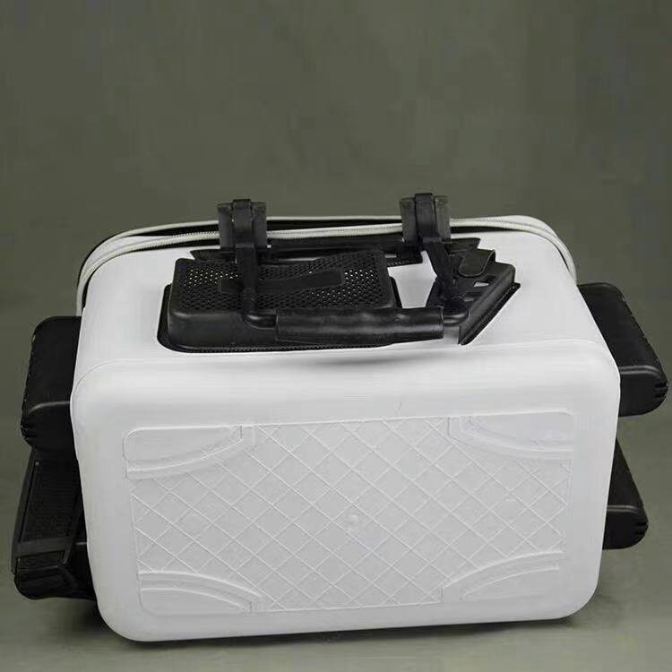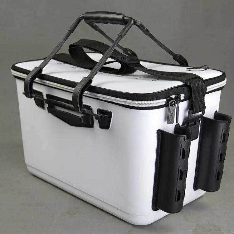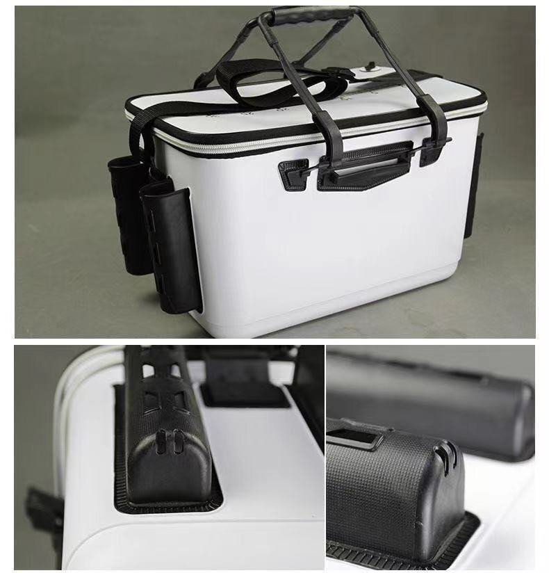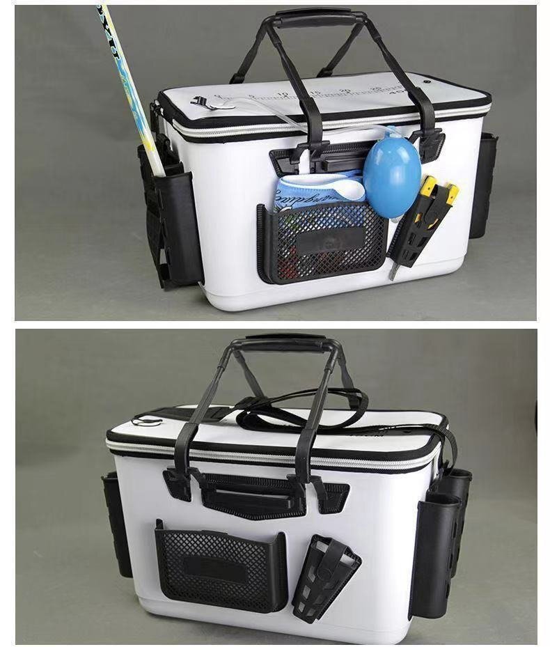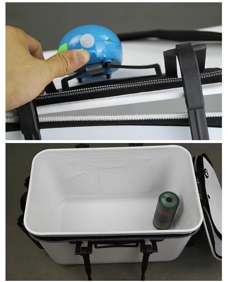 2.0mm厚を採用し、型くずれしにくいセミハードボディの仕上がり。 軽量と頑丈さを両立したEVA製で自立性に優れたハードボディ大容量、多彩な機能をトータルに配置します。 エアーポンプを設置して生餌のバッカンに使用できます。 エアーチューブを通せる穴が付いているので蓋を閉めたままエアーポンプが使用可能!