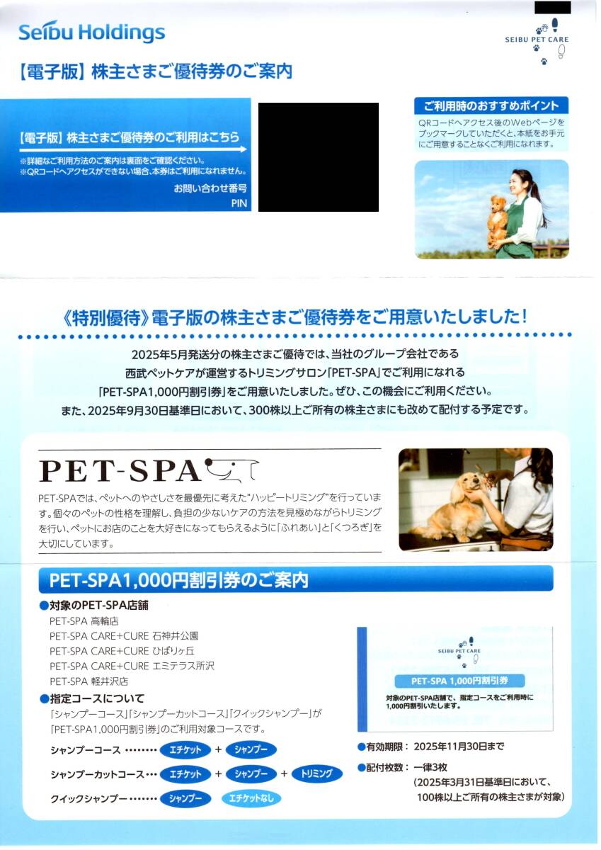 西武ホールディングスの株主優待のPET-SPA 1,000円割引券1枚です。
