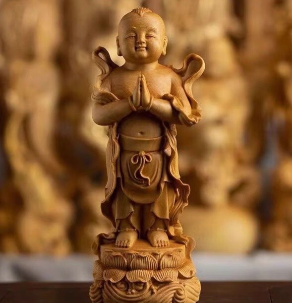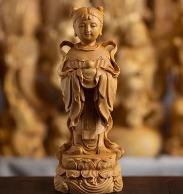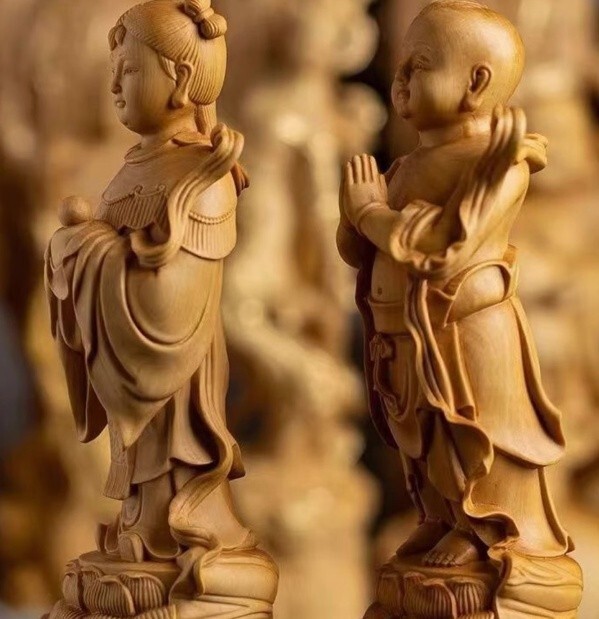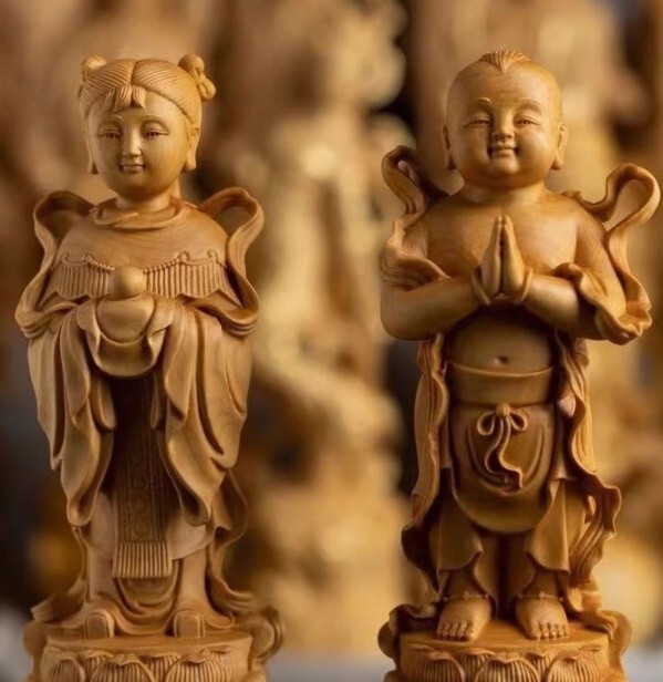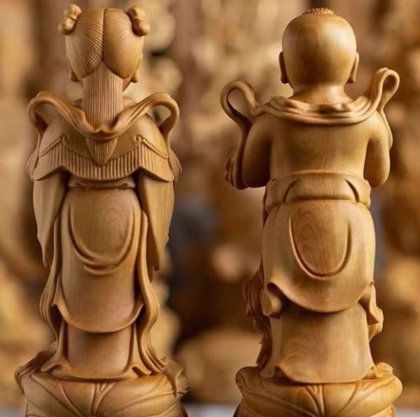 【運気】上昇 太行崖 ヒノキの金色の男の子と翡翠の女の子の飾り、無垢材の彫刻、男の子と女の子のデスクトップ、幸運