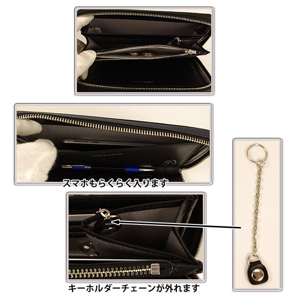 本体素材には細かな格子状の型押しレザーを使用し、深みのある印象と傷が付きにくいという実用性を兼ね備えています。
