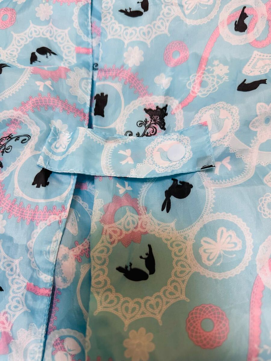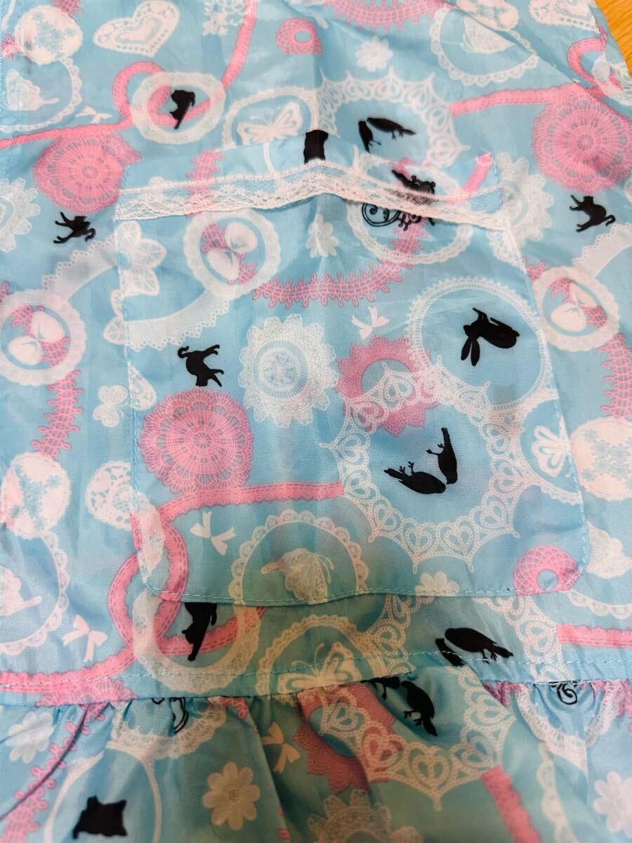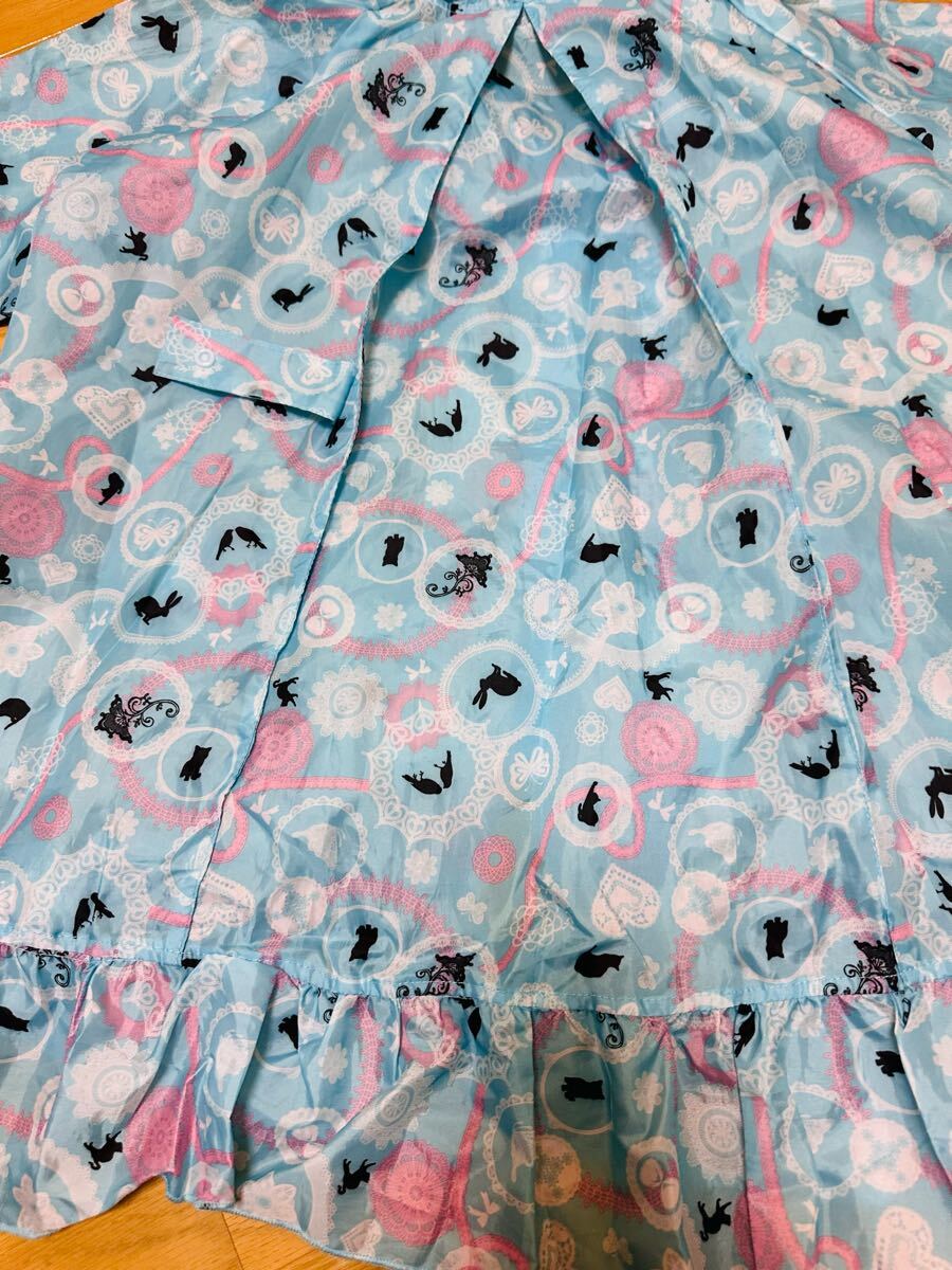 水色にピンクの模様で、黒のシルエットのウサギや猫、ハート、鍵などのモチーフがちりばめられています。裾はフリルになっています。袖やポケットにレースも施されていて女の子らしいデザインになってます。
