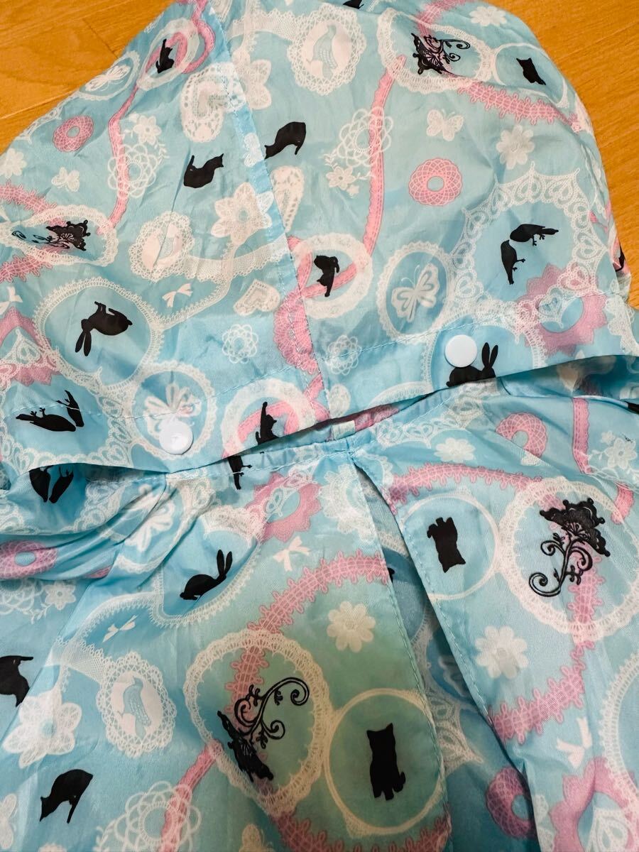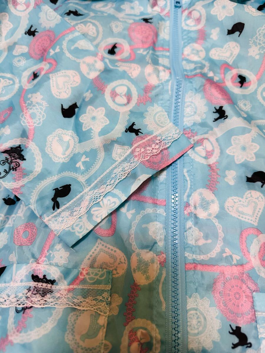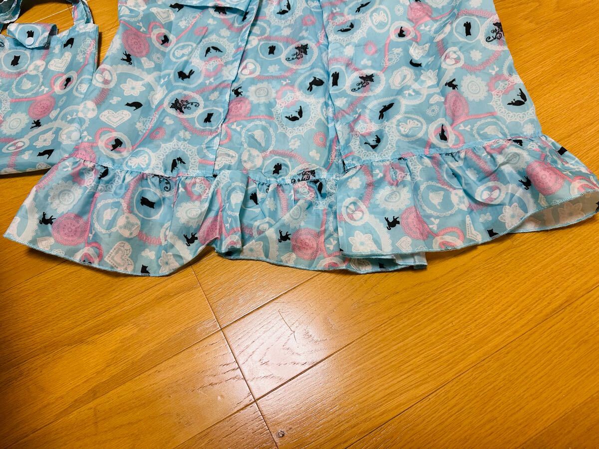 水色にピンクの模様で、黒のシルエットのウサギや猫、ハート、鍵などのモチーフがちりばめられています。裾はフリルになっています。袖やポケットにレースも施されていて女の子らしいデザインになってます。