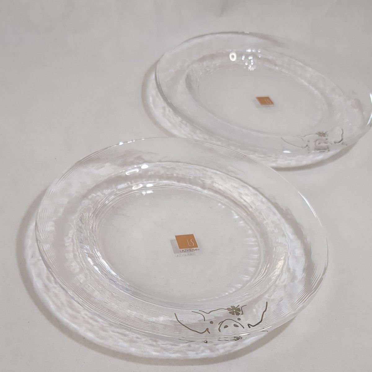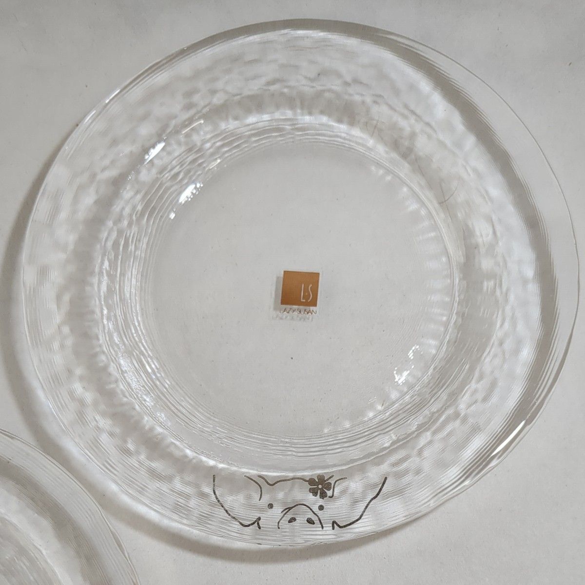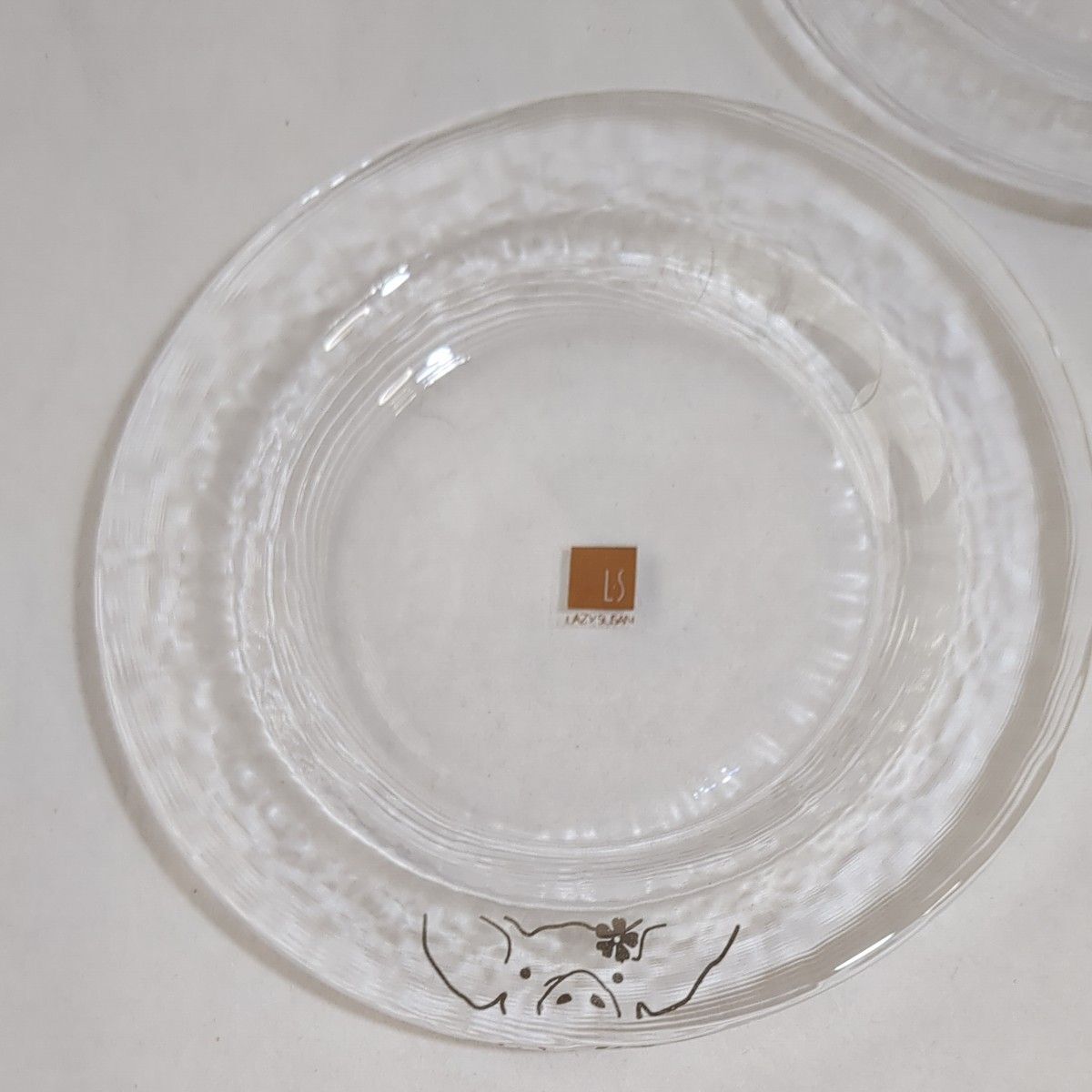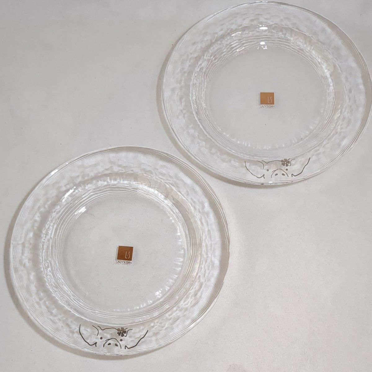 レイジースーザン LAZY SUSAN ブランドのデザート皿2枚セットです。クリアガラスの裏面に細かい線模様が入り、光の加減により美しい輝きが楽しめます。花を飾ったブタさんのイラストがシルバーでワンポイントで描かれています。食後のデザート皿として、色とりどりのフルーツやシャーベットを楽しむ器としていかがでしょうか。オールシーズンでお使いいただけますが、これからの暑くなる季節には特におすすめです。リムありですので、少し水気のある食材も大丈夫です。