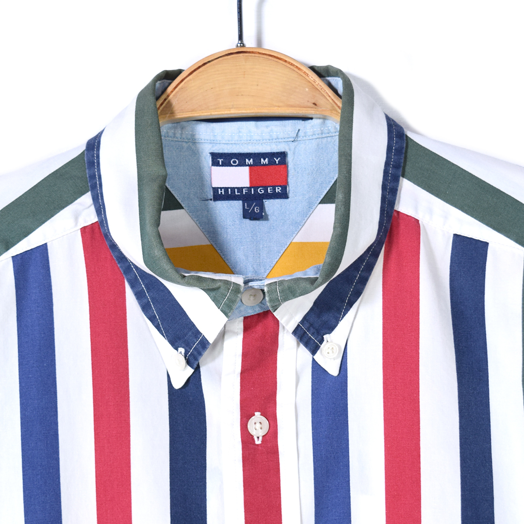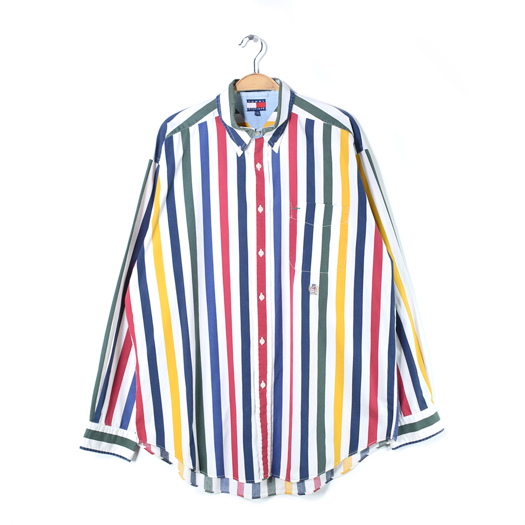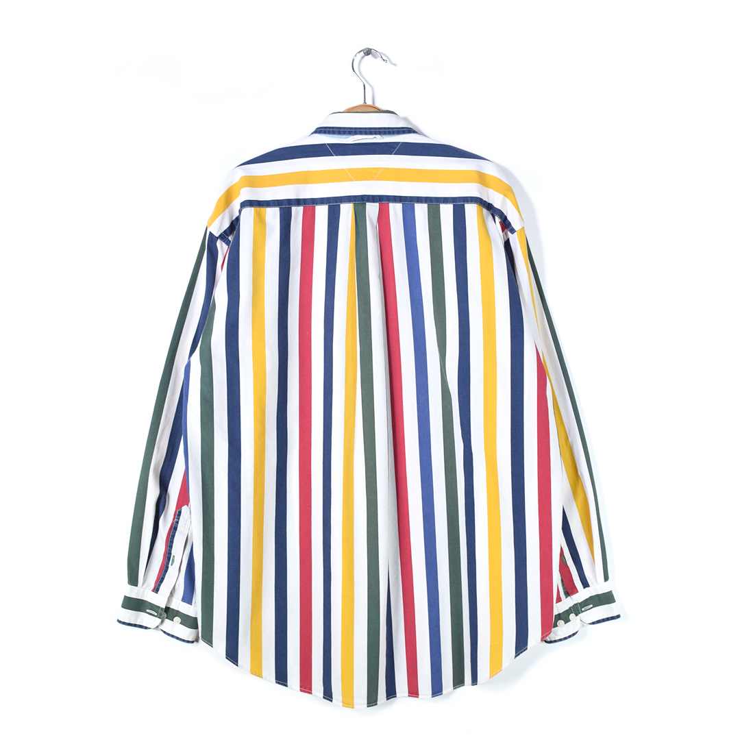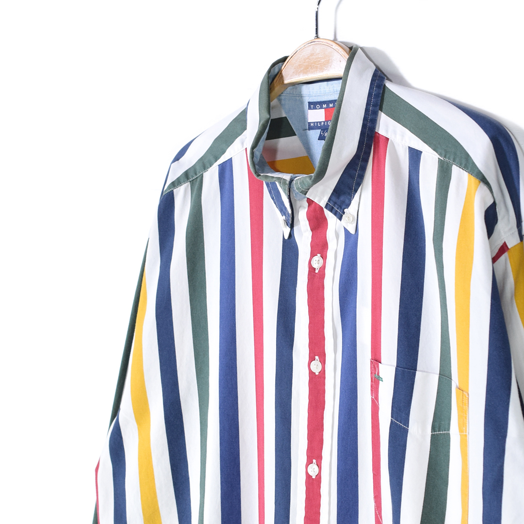90s トミーヒルフィガー マルチカラー ボタンダウンシャツ ストライプ エンブレム 旧タグ オールド TOMMY HILFIGER メンズL 古着 @CA1461