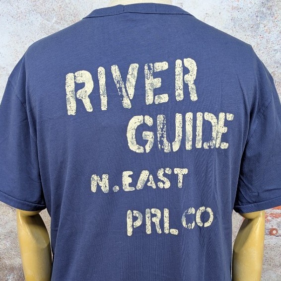 フロントロゴはチームロゴ。右袖にはTシャツでは珍しいブラックバス?のような魚がデザインされたワッペンが、装着されております。バックには仲間同士で書きあったかのようなデザインはアメリカならではです。ヴィンテージ落書きパンツようですね。