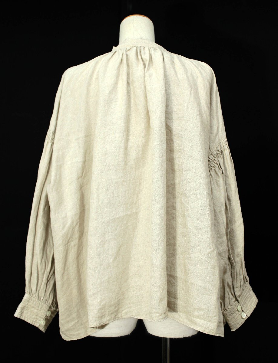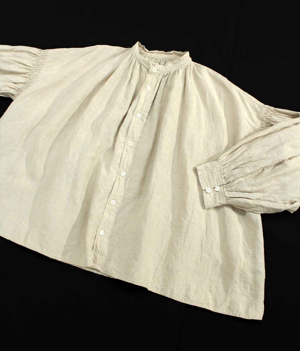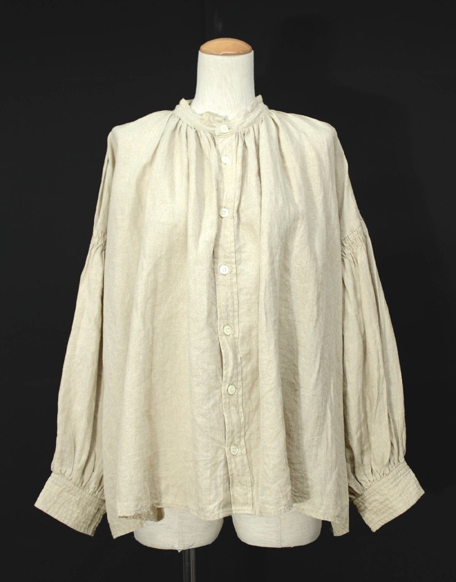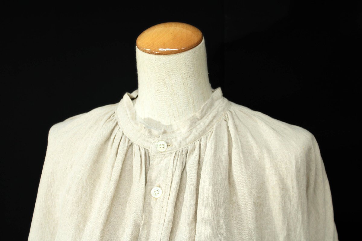 襟周りにはたっぷりのギャザーが入っており、ふんわりとした丸みのあるフォルム。