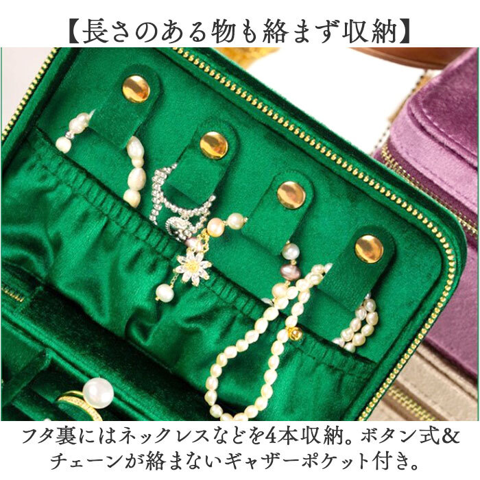 | 商品説明 | ・・【アクセサリーをすっきり整理整頓】 ・ごちゃつかずに収納&大切に保管◎「ベロアアクセサリーケース」。 ・【高級感のある大人な仕上がり】 ・起毛感のあるしっとり滑らかなベロア生地。上品な光沢が、華やかなアクセサリーにマッチ♪ ・【ぐるっと大きく180度オープン】 ・ダブルファスナーがラウンド型に開閉。中身を確認しやすく、出し入れもラクラク。 ・【お気に入りアイテムを1つに収納】 ・トレー付きの2段式。仕切りをアレンジでき、指輪やバングル、ブローチ、イヤリングをIN。 ・(※)トレーのリングスロット、下段メインルームの仕切りは取り外し可能です。 ・【長さのある物も絡まず収納】 ・フタ裏にはネックレスなどを4本収納。ボタン式&チェーンが絡まないギャザーポケット付き。 ・【傷付きを防ぐ柔らか内張り】 ・内張りも柔らかなベロア生地。大切なアクセサリーを傷や衝撃からガード◎ ・【置き場所に困らないコンパクトさ】 ・手に取りやすく場所を取らないサイズ感。長期の旅行や帰省など、持ち運びもOK。 ・【大切な方へのギフトにもおすすめ】 ・飽きが来ず長く愛用できるデザインが魅力。贈り物としてもおすすめ♪ ・【収納スペース】 ・トレー(上段):リングスロット×5(仕取り外し可能)、フリースペース×1 ・メインルーム(下段):フリースペース×8(仕切りは取り外し可能) ・フタ裏:スナップボタン式ネックレス掛け×4(下に1つギャザーポケット付き) |