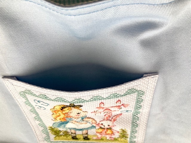 飾りの刺繍部分には薄い水色のクロスステッチ生地を使いました。