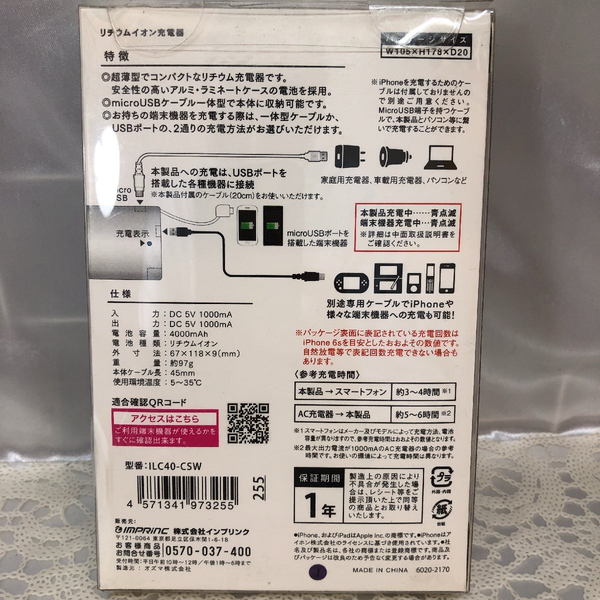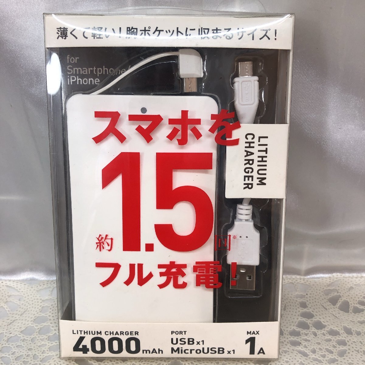 | LITHIUM CHARGER リチウムイオン充電器 モバイルバッテリー 4000mAh 約1.5回フル充電 インプリンク |