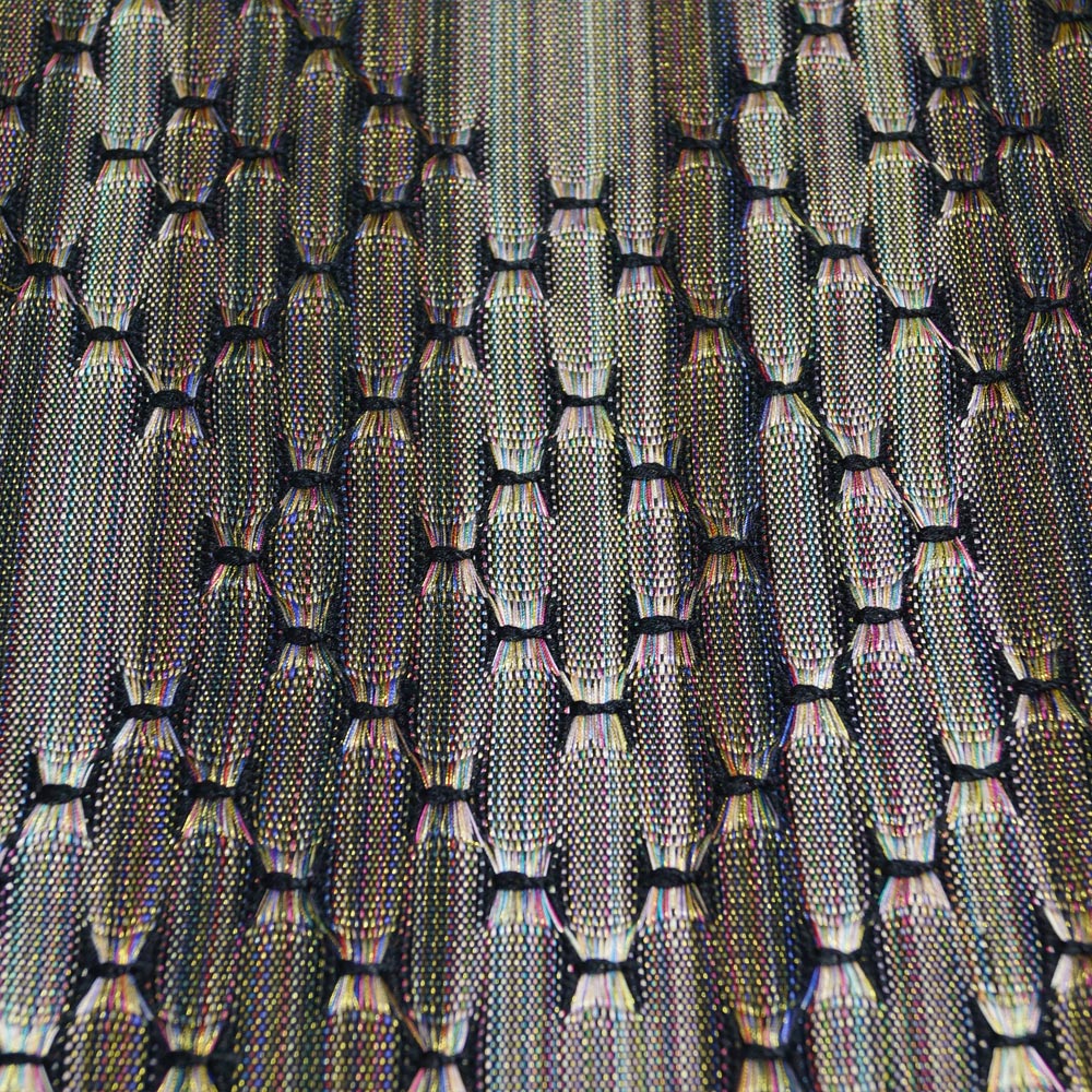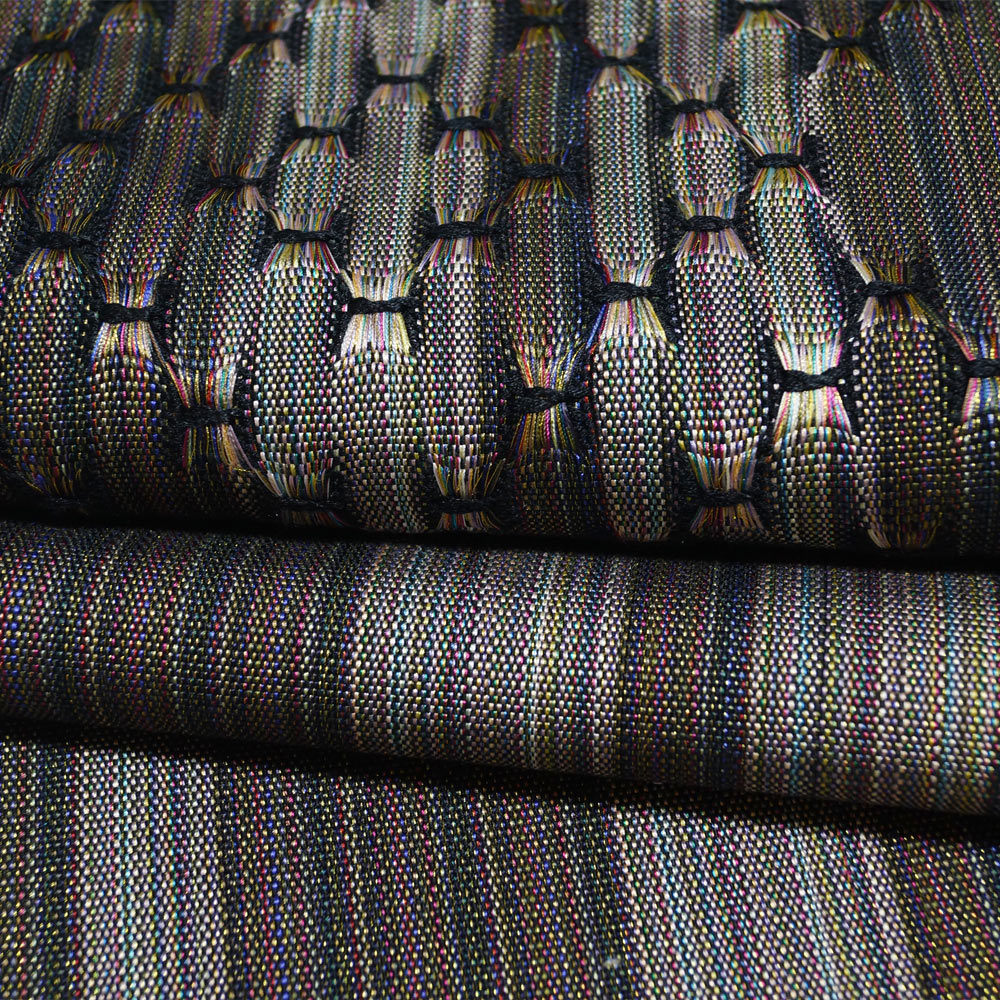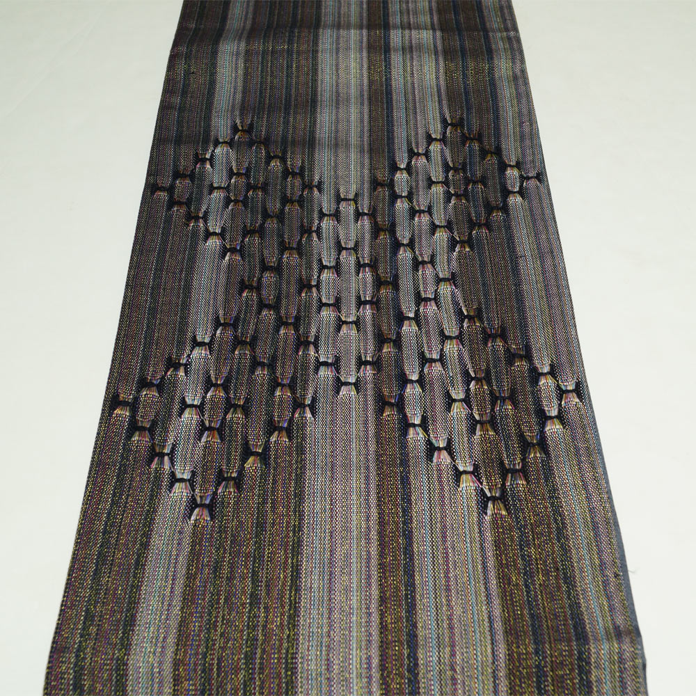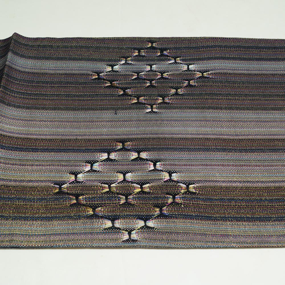 | 商品 説明 | 様々な色糸の縞模様の地に菱模様がリボン刺繍にて施された洒落袋帯です。裏地は紺鼠色系無地の紬地となっております。 |