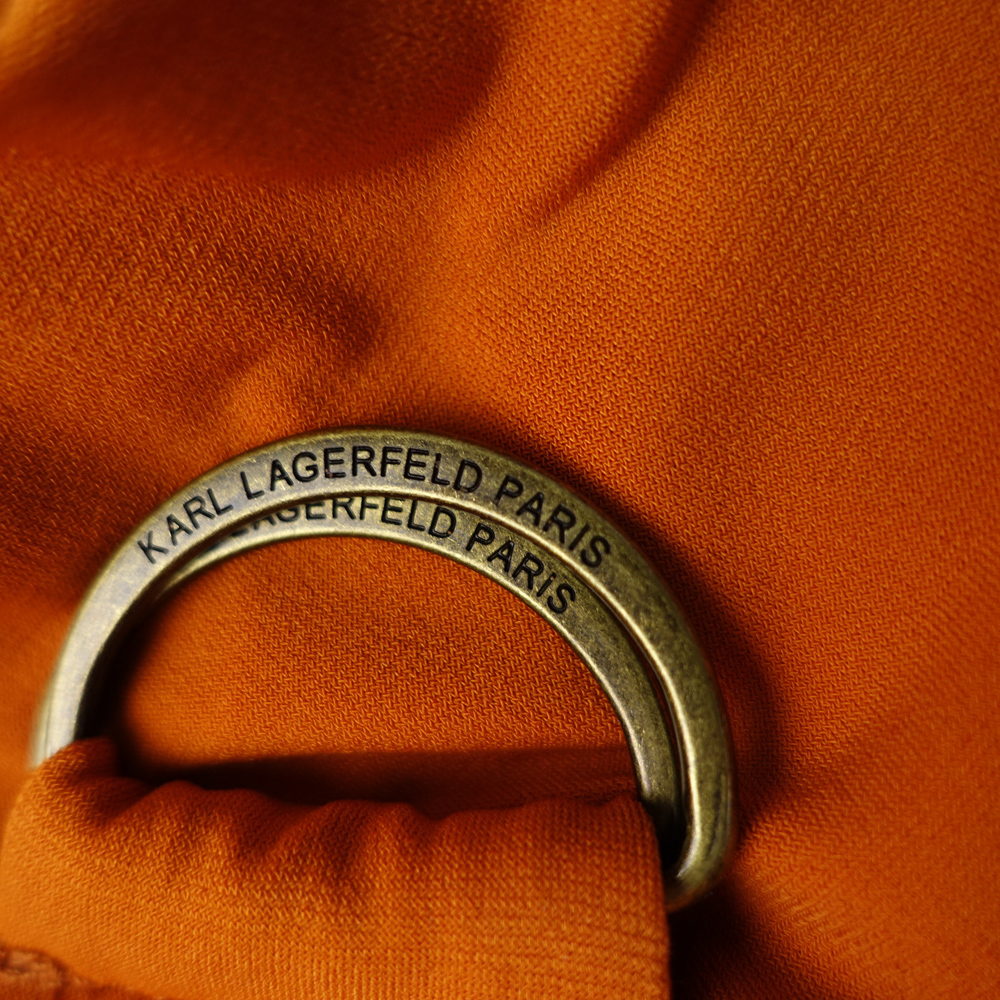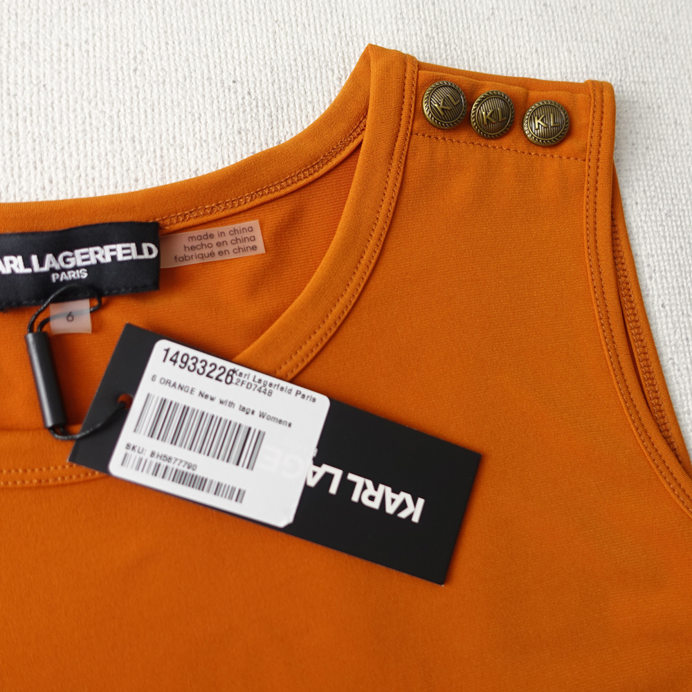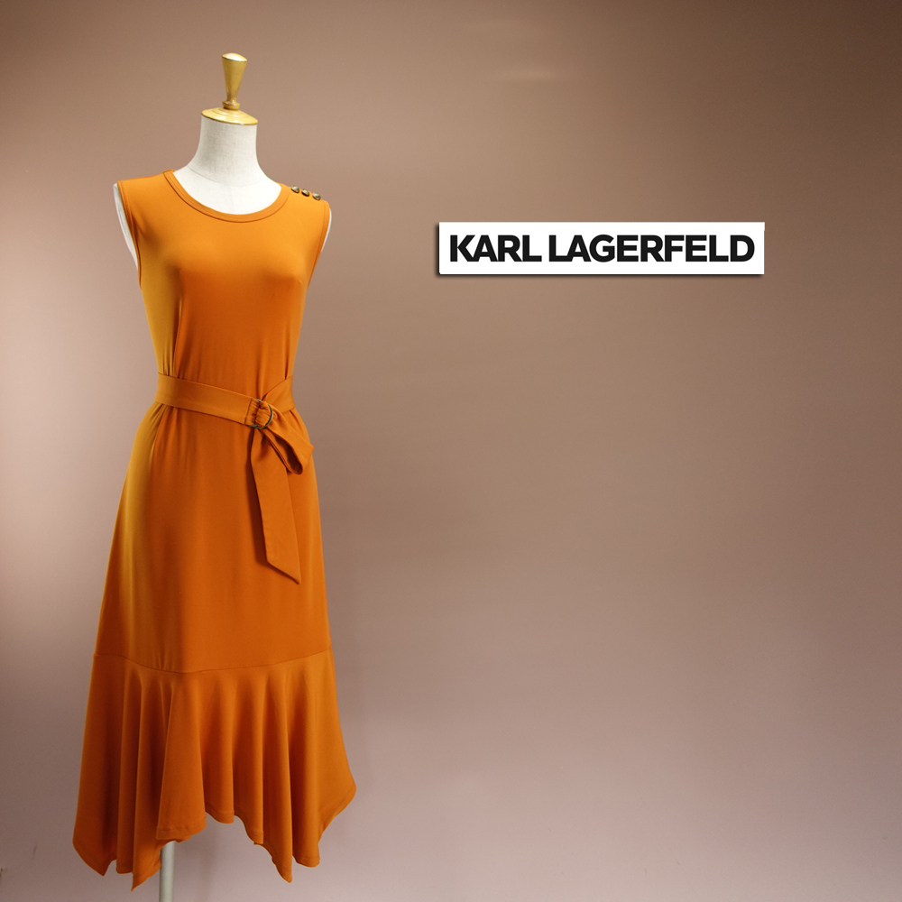 送料230円 新品カールラガーフェルド 17号 オレンジ ノースリーブ ロゴ入りベルト フレア ロング ワンピース リゾートドレス 凛44J0603