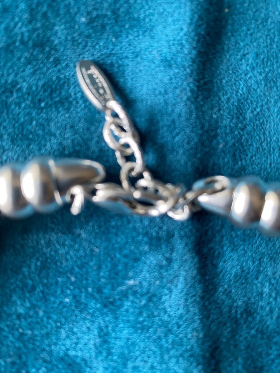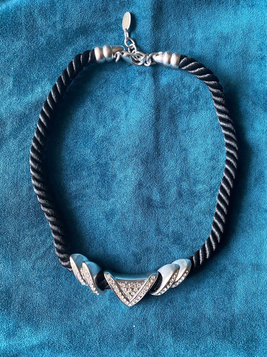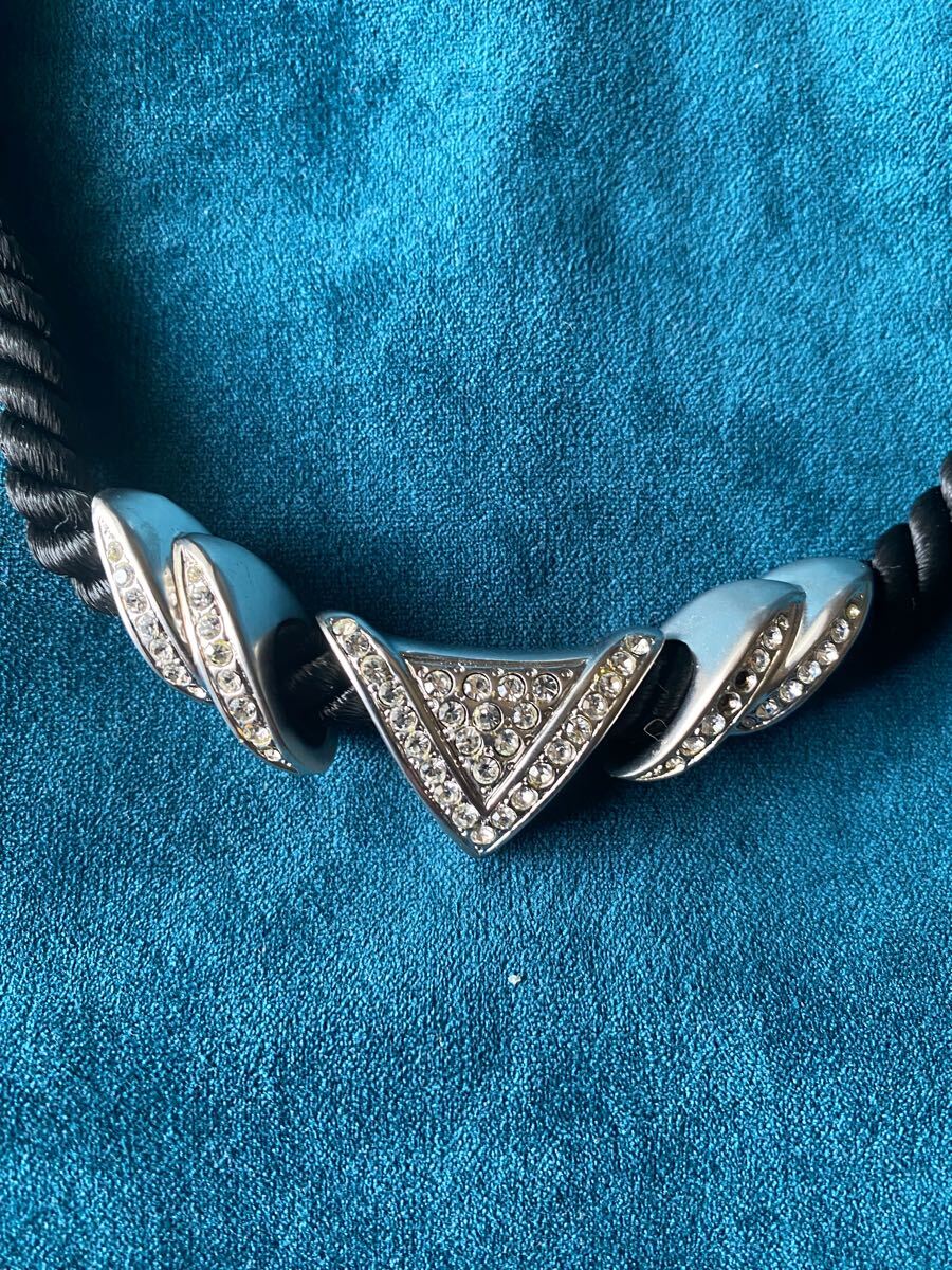 黒糸で綱のように組んだ紐に、メレダイヤをはめこんだ銀色の飾りと留め具の付いた素敵なネックレスです 長さ約42cm